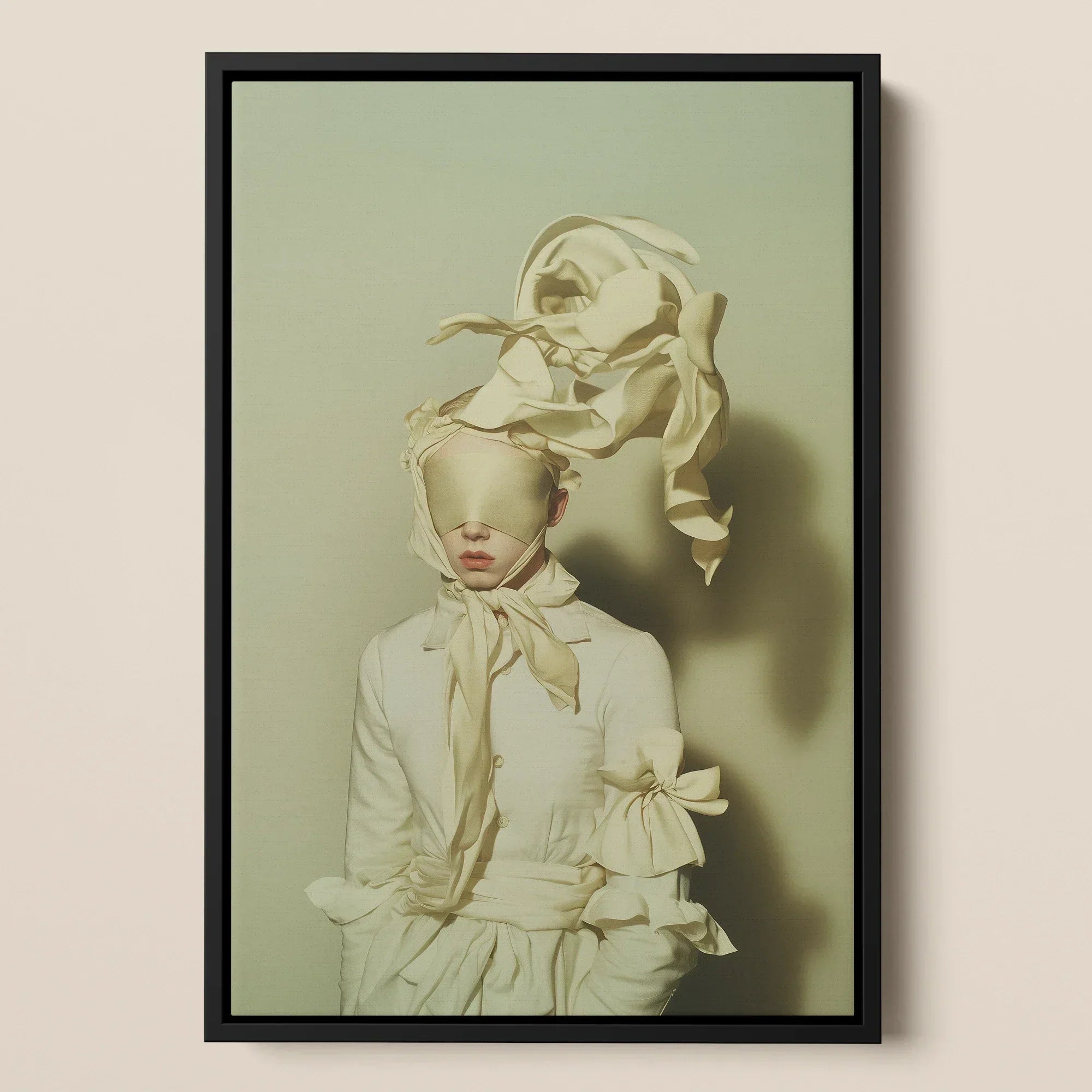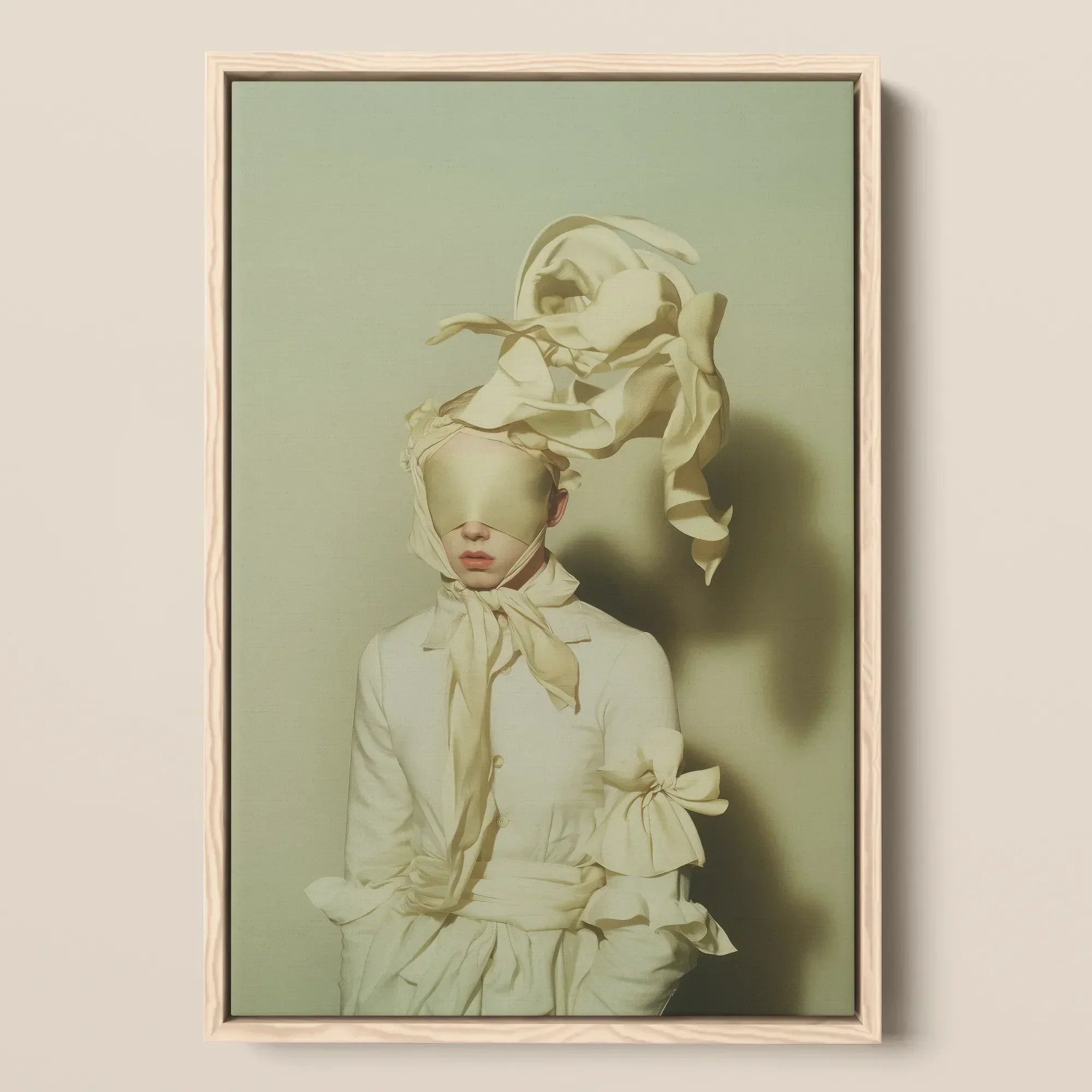 Een visie gehuld in sculpturale stilte, deze high fashion kunstdruk vangt een etherische metamorfose—waar stof ademt, identiteit oplost en schoonheid onbegrensd is. Het model, gehuld in watervallen van crèmekleurige vouwen, bestaat in een toestand van droomachtige opschorting. Een blinddoek van zachte zijde verbergt hun ogen, een symbool van transformatie, onderwerping of ontwaken. Boven, draait de stof hemelwaarts, een organische uitbarsting van beweging—als avant-garde couture gevangen halverwege de vlucht, alsof bevroren tussen beweging en stilte.