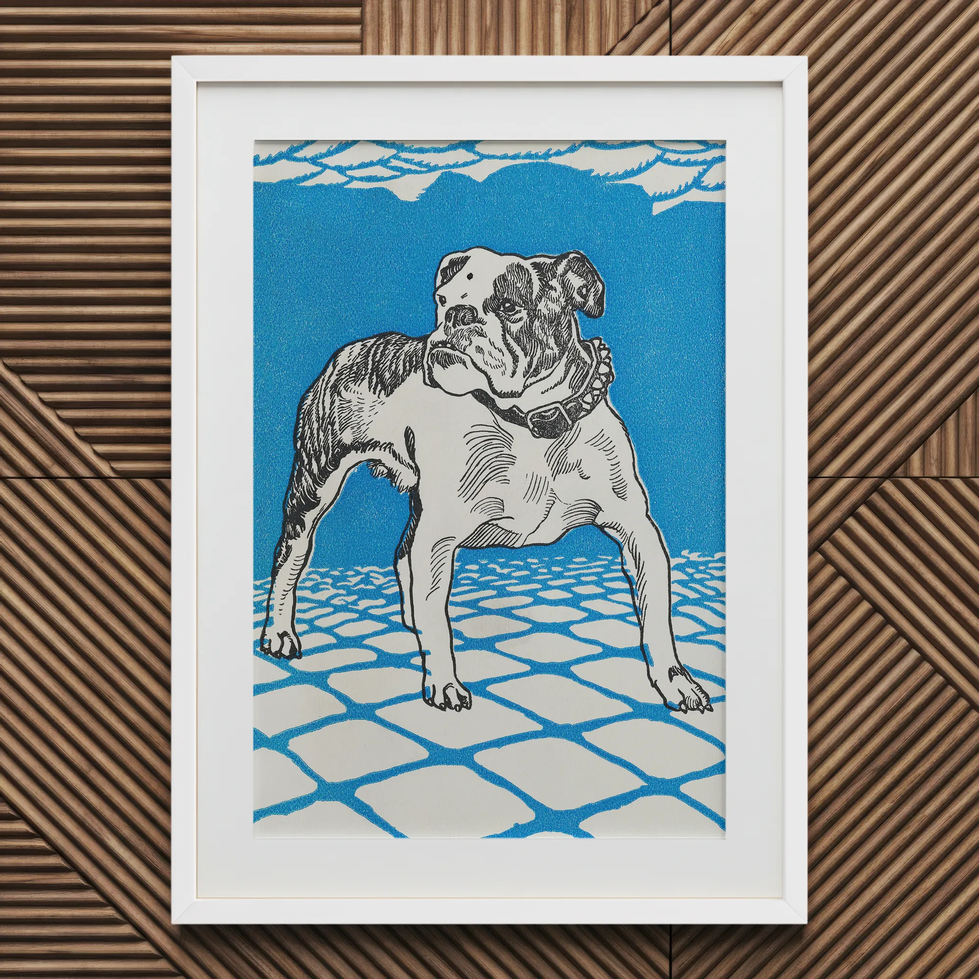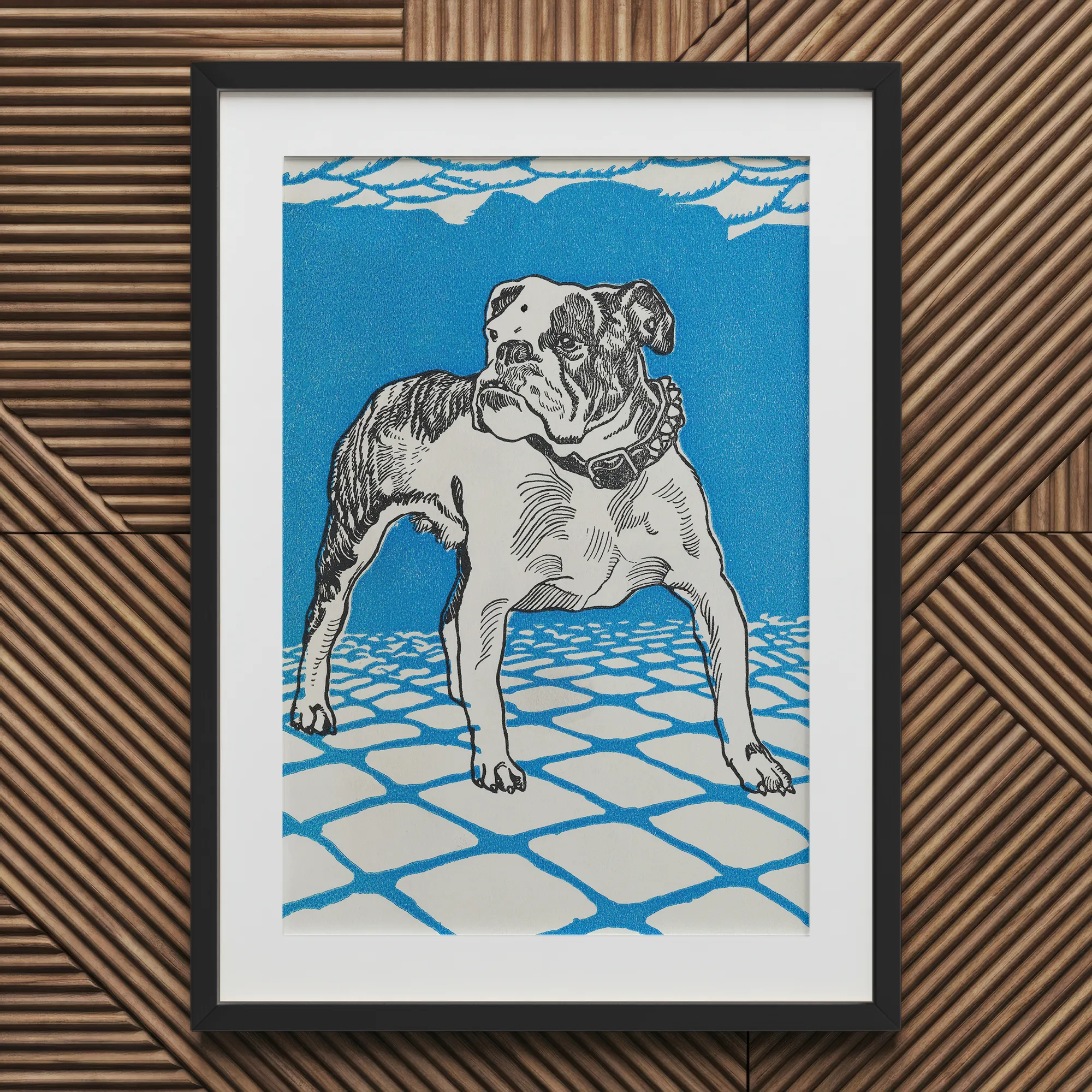 In deze opvallende lithografie springt Moriz Jung's "Bulldog" met elektrische vitaliteit uit het kader, en belichaamt de avant-garde geest van het vroege 20e-eeuwse Wenen. Tegen een hypnotische azuurblauwe achtergrond commandeert de gespierde vorm van de hond de aandacht, elke pees weergegeven met Jung's kenmerkende precisie.