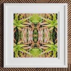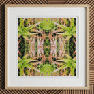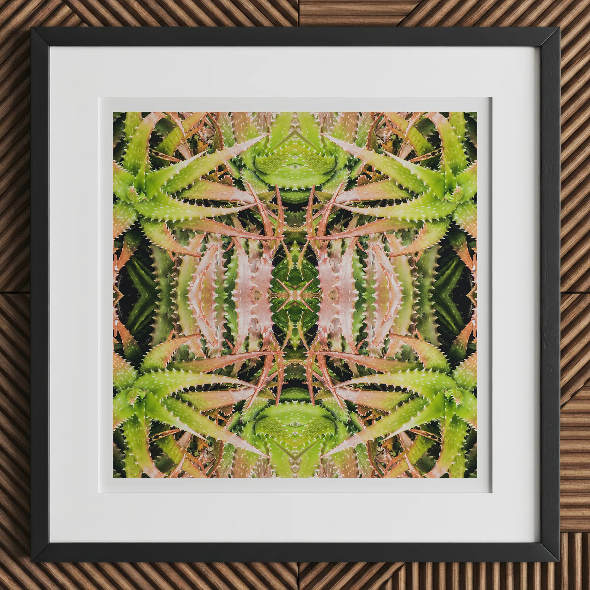 De hypnotische symmetrie van het kunstwerk, weergegeven in weelderige greens en zachtroze, verheft de woestijnflora tot kosmische proporties. Terwijl je naar deze ingewikkelde compositie staart, zul je getuige zijn van de veerkracht van de natuur die opnieuw wordt bedacht door een lens van geometrische perfectie. Elke doorn en blad, zorgvuldig gespiegeld en vermenigvuldigd, creëert een visuele symfonie die perceptie uitdaagt.
