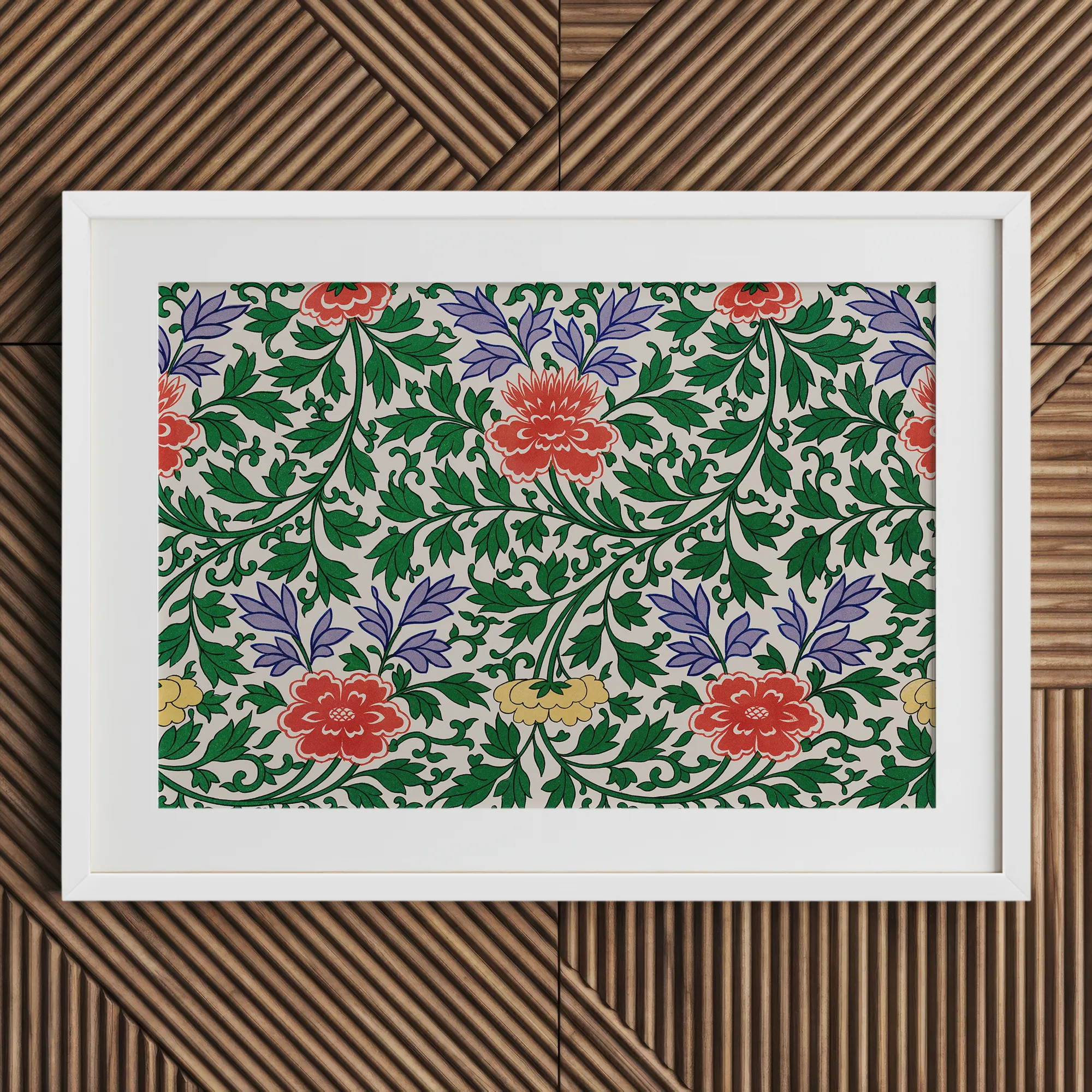 Dompel jezelf onder in het weelderige tapijt van deze Chinese botanische illustratie van Owen Jones. Een meesterwerk van Chinoiserie Elegance, deze boete kunstafdruk vervoert je naar een wereld waar levendige pioenen de opperste regeren, hun gewaagde rode bloemblaadjes zijn ontrafeld temidden van een zee van groen gebladerte. Delicate paarse bloemen dansen naast, waardoor een harmonieuze symfonie van kleur wordt gecreëerd tegen een ongerepte crèmekleurige canvas.