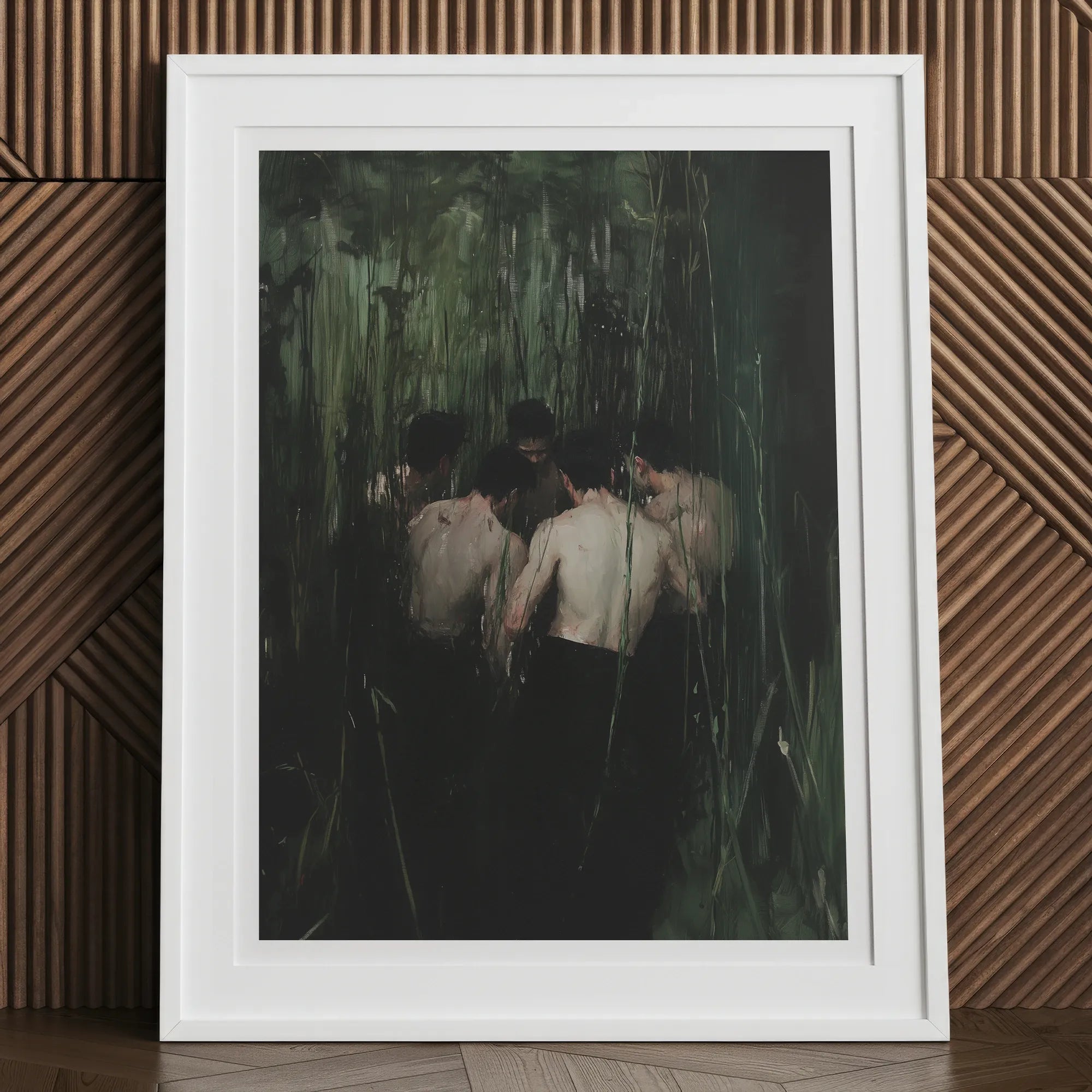 Elk lichaam is een syntactische eenheid: gekneusde grammatica, zachte schuring, een syntaxis van vingers die vlees kneden en verlangen trekken. Hun opstelling leest als choreografie—heidens, balletachtig, barok. De rietstengels wijken niet. Ze getuigen. Blik vastgehouden in plantaardige spanning.