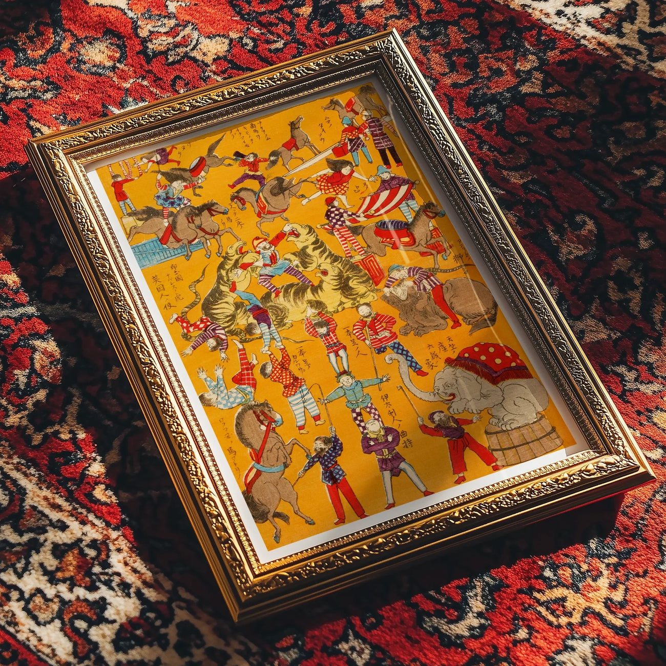 Dit is niet slechts decoratie; Het is een portaal tot een cruciaal moment waarop Japan wankelde tussen traditie en moderniteit. Laat deze print je ruimte omzetten in een pocket van verwondering, waar elke blik nieuwe acrobatische prestaties en culturele wonderen onthult. Omarm de geest van entertainment van Meiji-tijdperk en breng een stukje circusgeschiedenis mee naar huis.