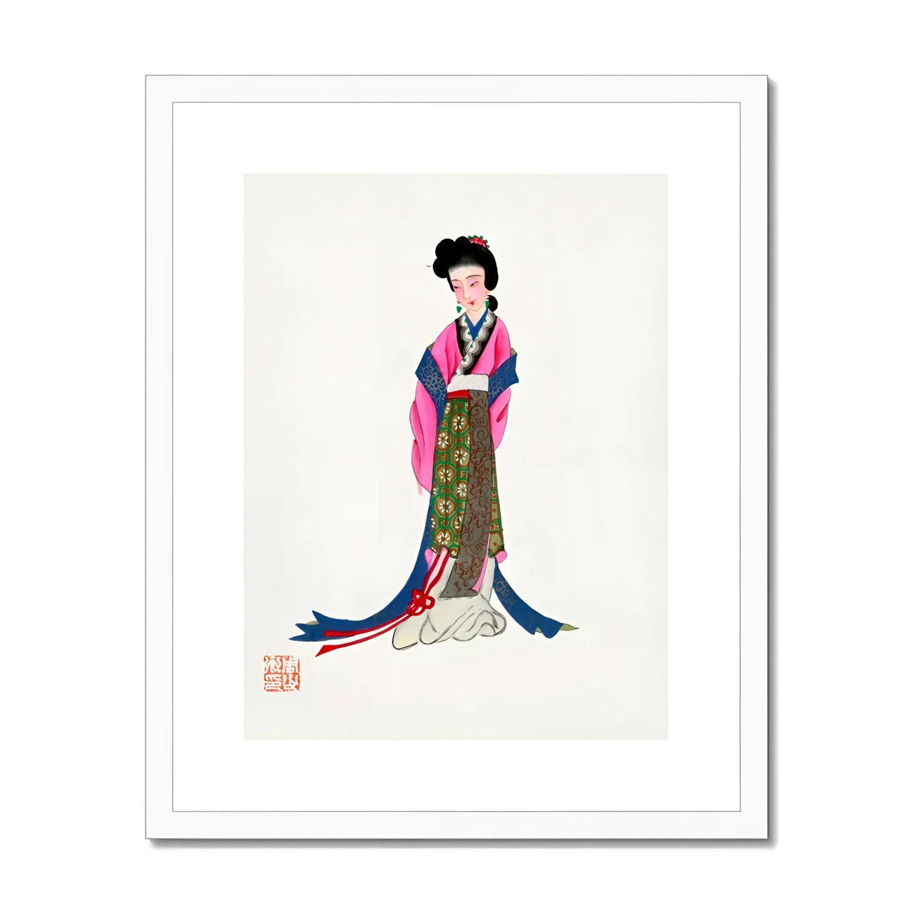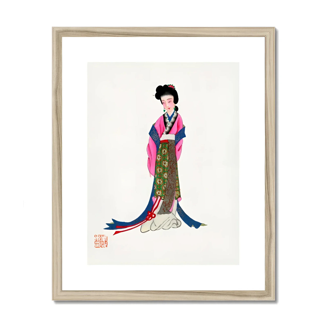 Zie een symfonie van Tang -dynastie weelde. Je bent getuige van een hoofse dame, haar silhouet een cascade van levendige tinten. Fuchsia mouwen mouwen gollow zoals pioenblaadjes, omlijsten azuurblauwe diepten versierd met middernachtbloei. De Obi-achtige sjerp, een groene canvas van chrysanthemums, kinneert haar taille.