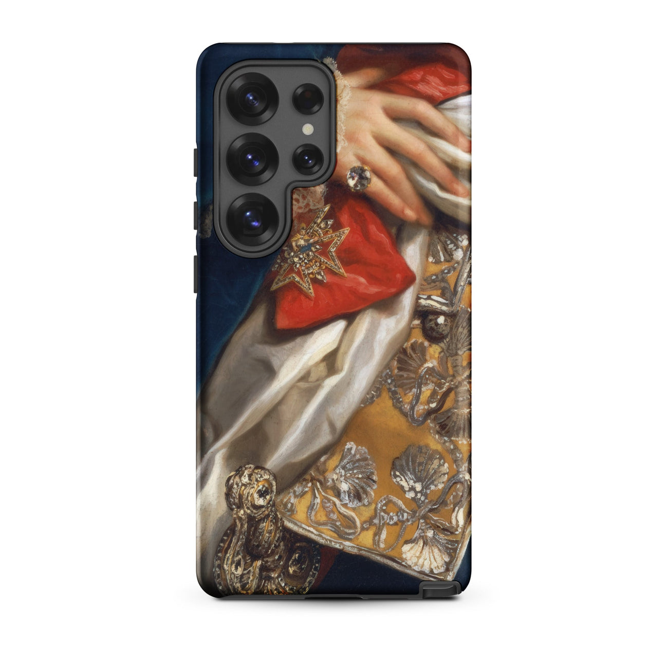 Het fragment van aristocratische kleding op deze Samsung-hoes vangt de ceremoniële pracht van de Bourbon-dynastie. Waar adellijke afkomst en aristocratische pracht schitteren door ambachtelijk detail en symbolische autoriteit.