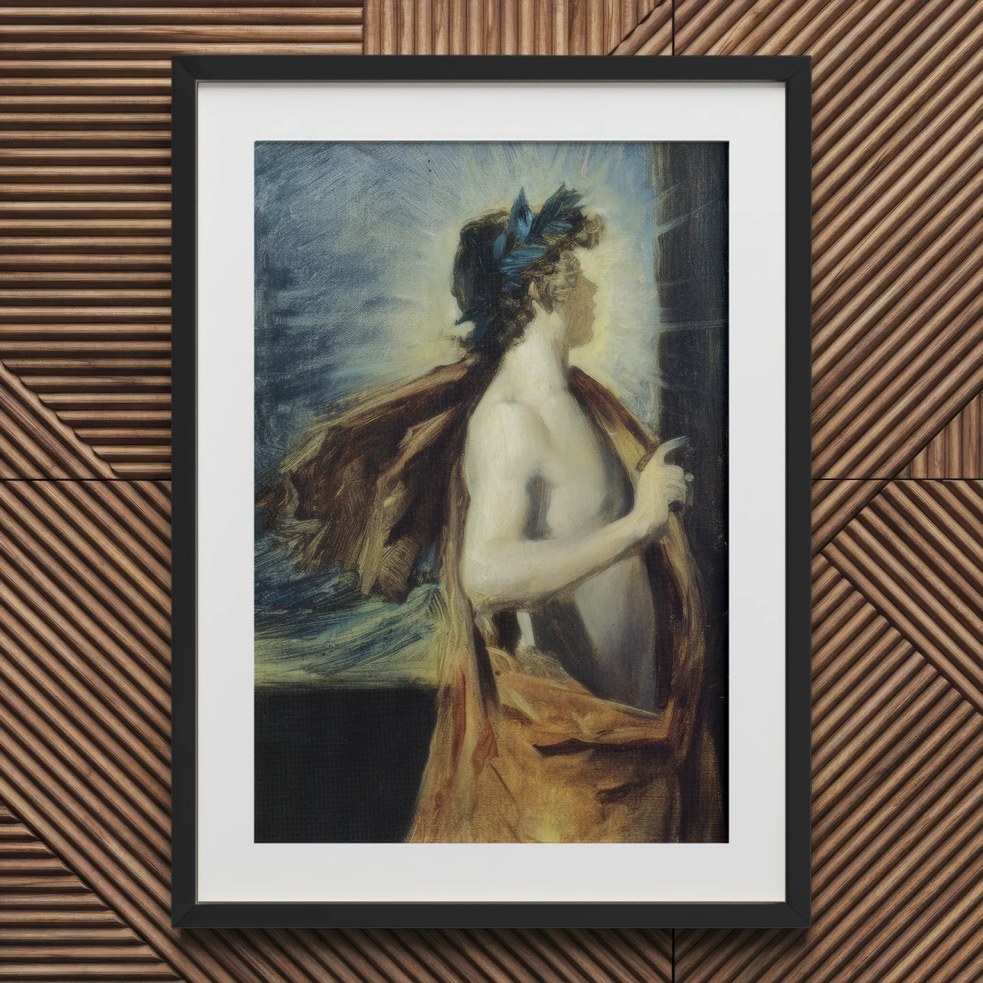 Licht ontploft om hem heen, een gloedvolle kroon gesmeed uit beweging zelf. John Singer Sargent kanaliseert Velázquez maar schildert Apollo als verschijning: blootgeschouderde jeugd gevangen tussen goddelijkheid en schittering. Elke penseelstreek zoemt met metalen hitte—lapis schaduwen, omber stof, oker gloed. Zijn profiel lijkt gebeeldhouwd uit storm; die blauw-bladige krans brandt als geoxideerd brons.
