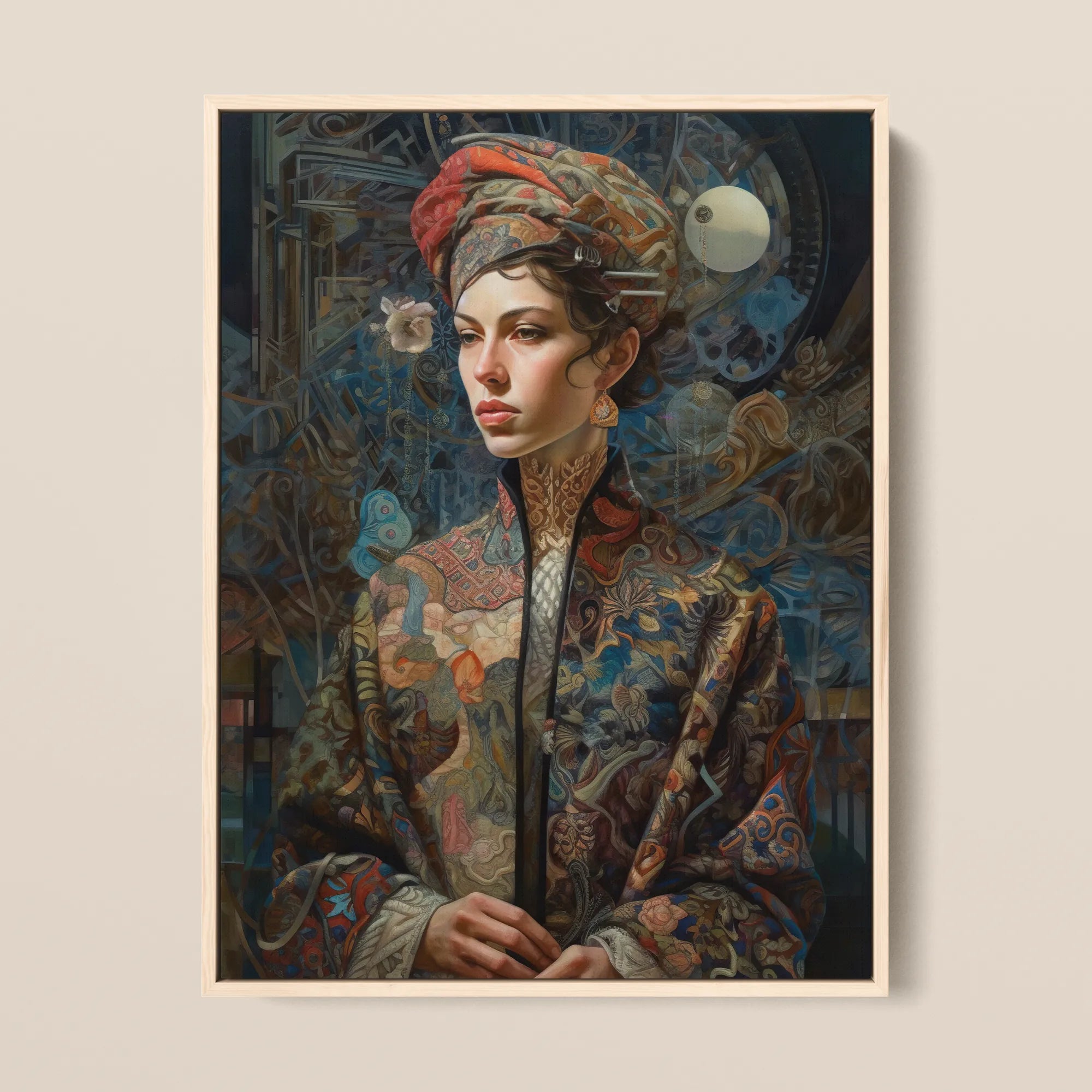 Haar kleding—geweven met vergulde filigraan en mythische beesten—zijn niet zomaar stof maar een kaart van voorouderlijk geheugen. De symbolen van de Oud-Noorse mythologie kronkelen door geborduurde draden, hun betekenis verhuld, wachtend. Tandwielen smeulen op de achtergrond, de overblijfselen van een verloren beschaving of de blauwdrukken van een tijdperk dat nog moet komen. Hier botsen fantasie en folklore, een etherisch steampunk muurkunst meesterwerk dat niet alleen siert—het betovert.