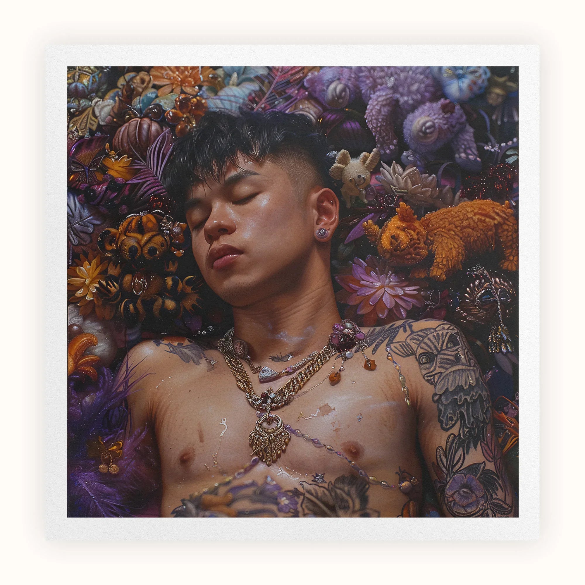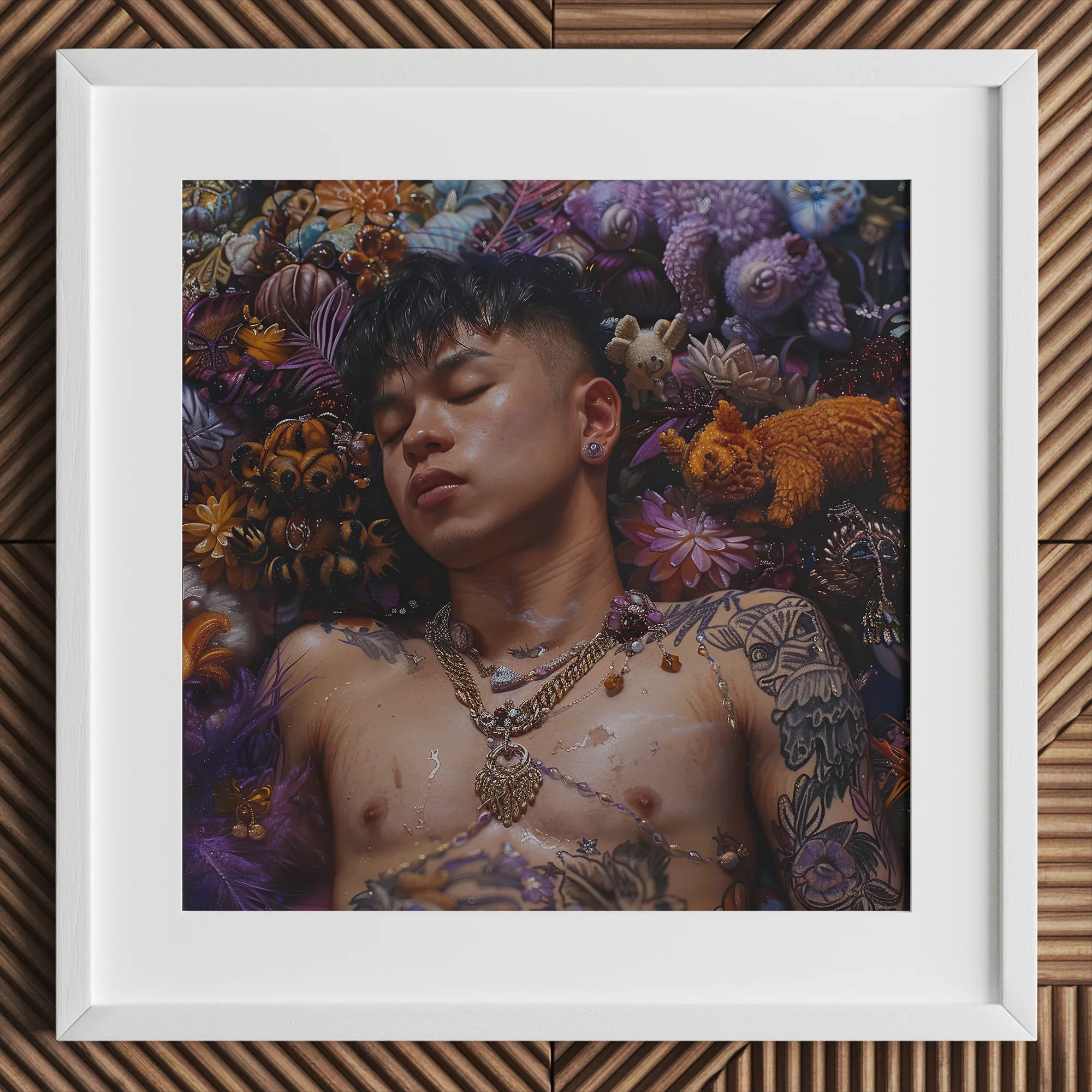 Dit is niet zomaar een kunstdruk. Deze Gebogen & Uitgeputte Thaise twunk eist aandacht. Rauwe sensualiteit druipt uit het frame. Trekt je in zijn natte droomruimte. Een ruimte die zowel erotisch als heilig aanvoelt. Zijn kwetsbaarheid, gelaagd onder dat koele uiterlijk, doet je je eigen kwetsbaarheid in twijfel trekken. Kijk jij naar hem, of laat hij jou binnen?