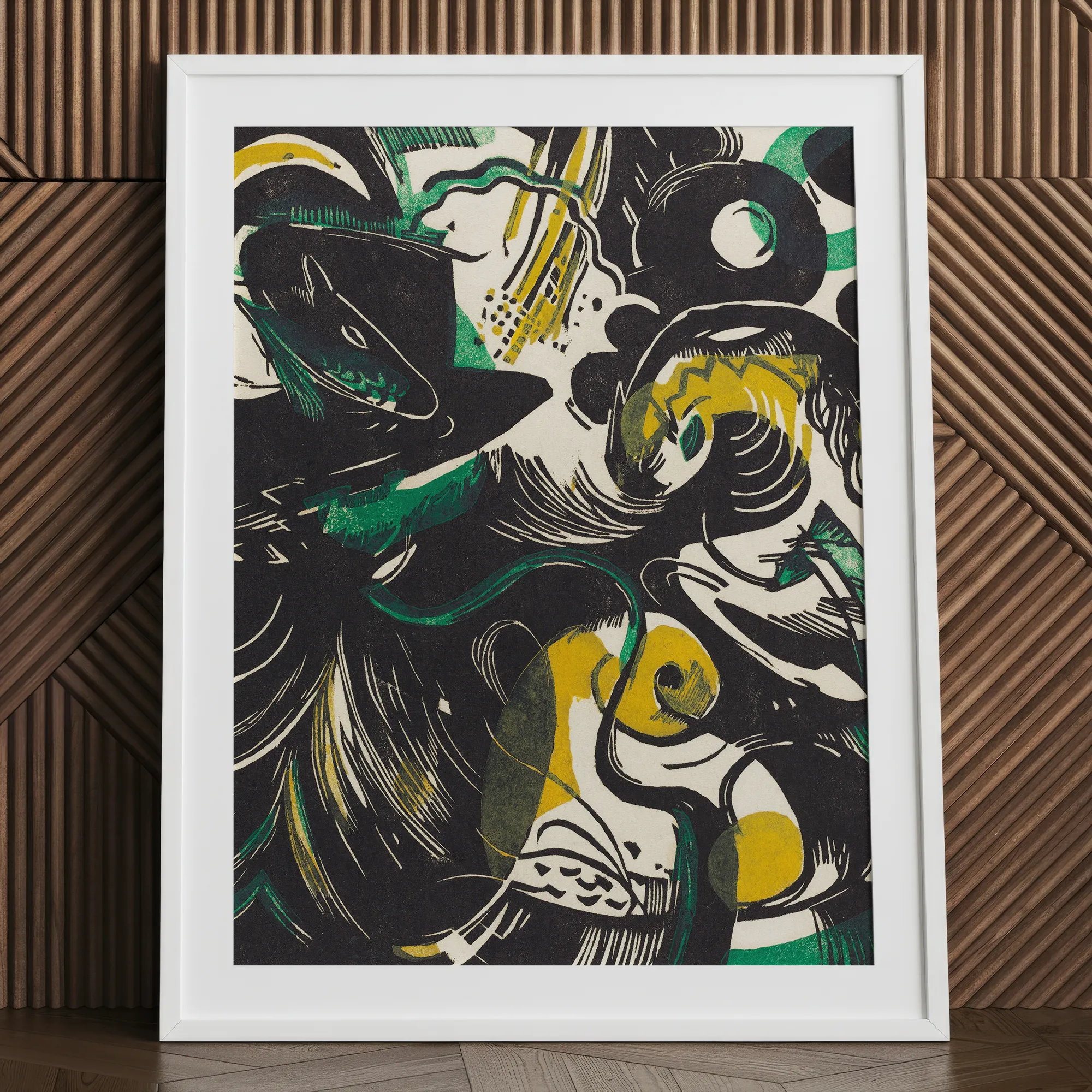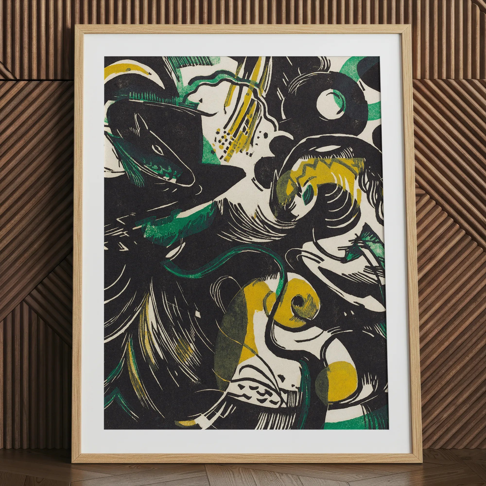 Dompel jezelf onder in de wervelende chaos van Franz Marc's 'Genesis II', waar primordiale energie uiteenloopt in een symfonie van zwart, groen en goud. Deze betoverende houtsnede print vangt de ruwe kracht van creatie, zijn dynamische lijnen en gedurfde vormen die de tumultueuze geboorte van een nieuwe wereld oproepen.
