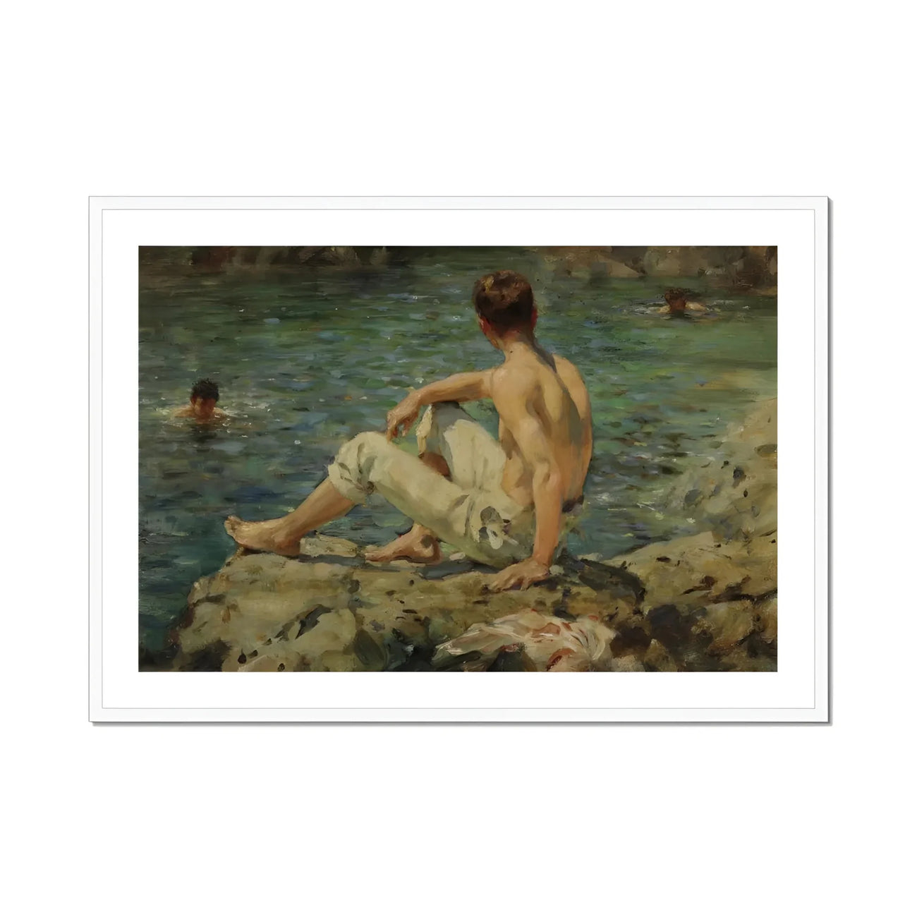 Tuke's penseelstreken verslinden de glinstering van de Atlantische Oceaan, en bieden een moment dat is opgehangen in die laatste trilling van de zomer, waar zonovergoten huid en zeewater samensmelten in heidens genot. Het vluchtige lyriek van de jeugdige huid bewarend, half-vergeten, half-immortaal, geweven in groen en goud.