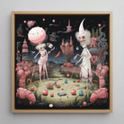 Dit lowbrow surrealistische kunstwerk geniet van tegenstrijdigheid: grotesk maar speels, macaber maar uitnodigend. Elk griezelig schattig detail—spookachtige verschijningen met holle ogen, onmogelijke architectuur, de spookachtige echo van een verlaten spel—trekt je verder in zijn hypnotische greep. Een stuk voor liefhebbers van het onheilspellende, het gotische, het absurd mooie. Donkere fantasie ontmoet pop surrealisme, waarbij nostalgie samensmelt met het nachtmerrieachtige in een visuele symfonie van het vreemde.