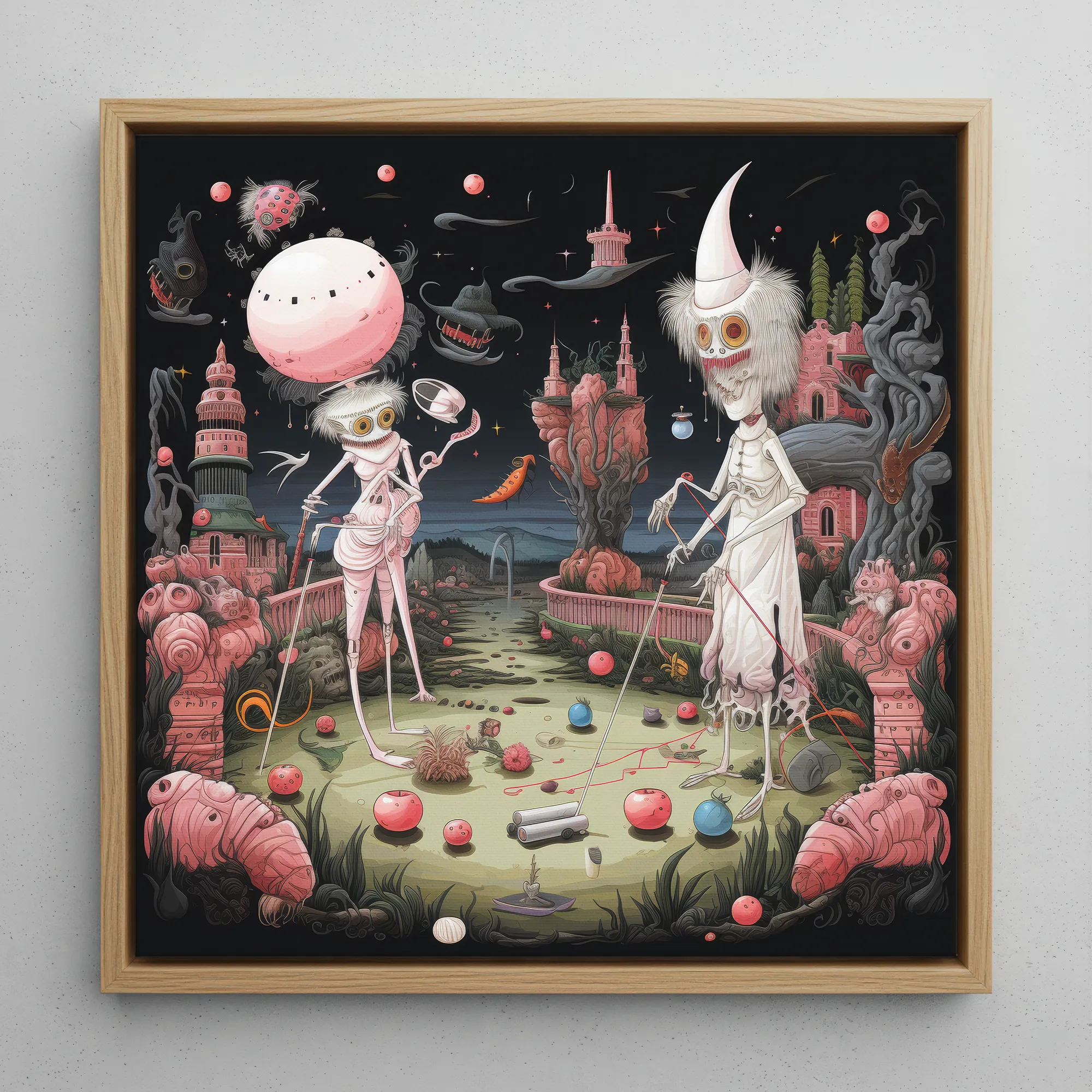 Een spelletje croquet—of een kosmisch ritueel? Onder een hemel bezaaid met zwevende manen en grijnzende schaduwen staan twee spookachtige figuren klaar, hun benige handen traceren onzichtbare strategieën. Hun wereld is een koortsdroom—bomen verwrongen als grijpende vingers, bollen van onnatuurlijk licht verspreid als vergeten relikwieën van een verloren dimensie. De lucht zoemt met griezelige speelsheid, een carnaval van het onderbewuste waar het surrealistische en sinistere in ongemakkelijke harmonie walsen.