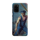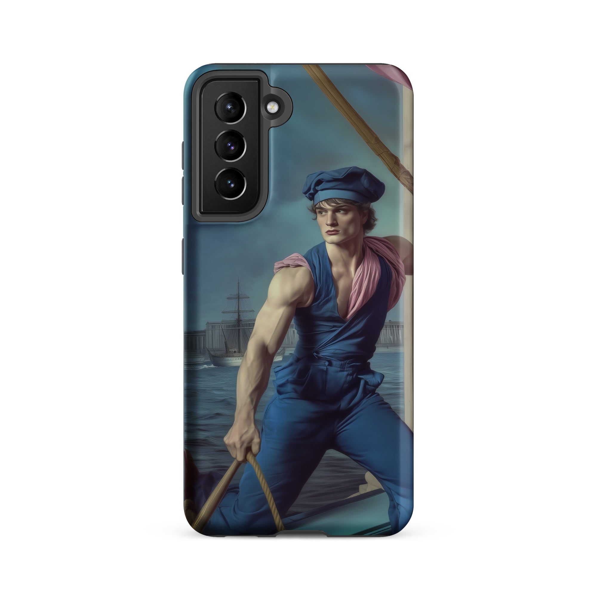 Een kobaltblauwe vloed omhult zijn lichaam, genaaid in een matrozenkleding die zich vastklampt met het gemak van zoutgekruid katoen. Zijn pet tipt naar de wind, ogen gericht op een horizon voorbij de drukke masten van de scheepswerf. De riemen bijten in het water bij elke haal, spieren werken als tuigage onder spanning. Een blos van rozenstof krult over zijn schouder, zacht tegen de harde geometrie van het werk.