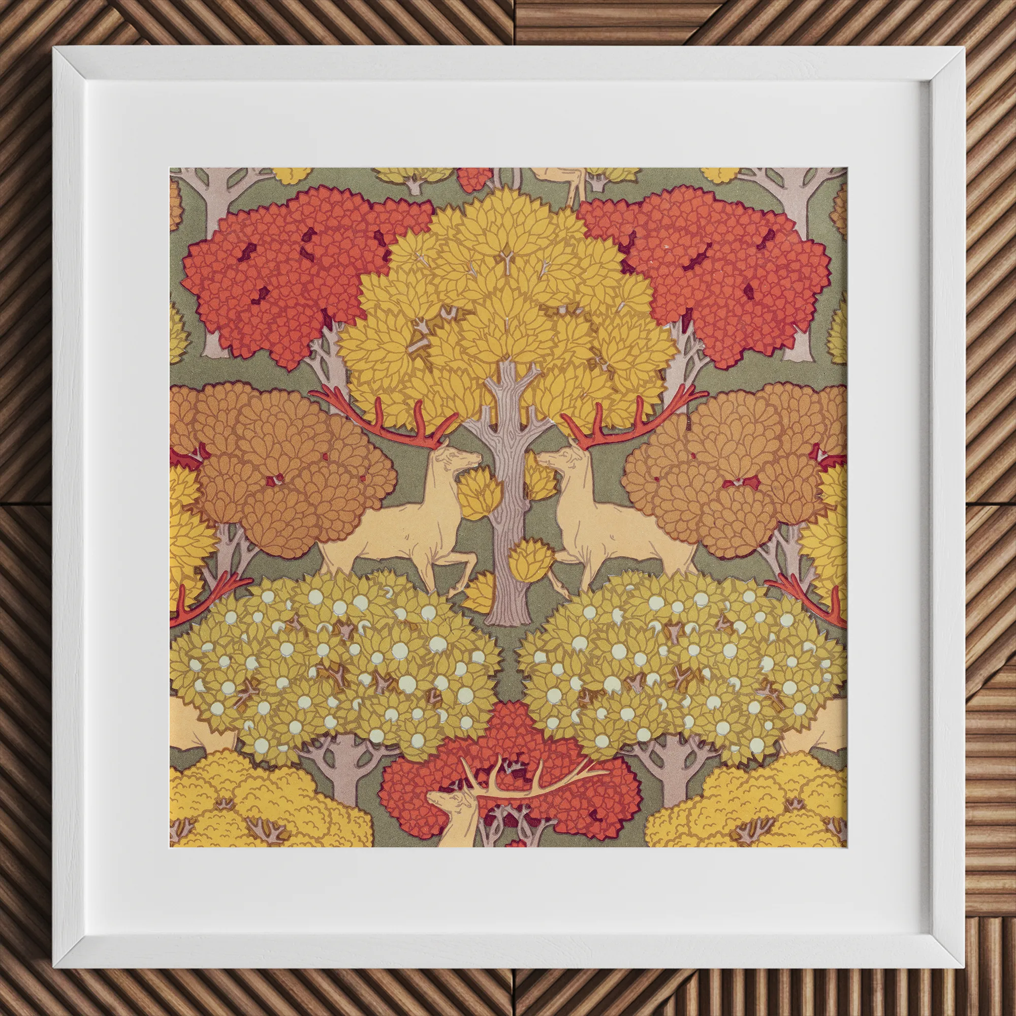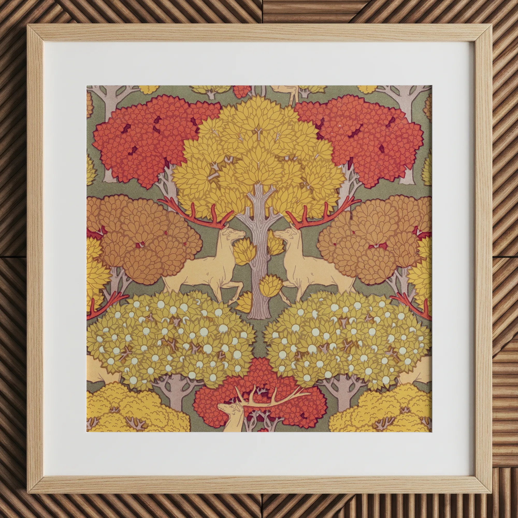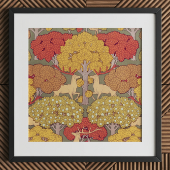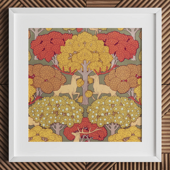 Je wordt onmiddellijk geboeid door het samenspel van okerkleurige herten, hun geweien die de boomkruinen boven hen weerspiegelen, geplaatst tegen een wandtapijt van herfstbladeren in vlammend rood en gepolijst goud. Verneuil's nauwgezette lijnwerk blaast leven in elk blad en elke tak, waardoor een ritmische dans van vorm en kleur ontstaat die de organische vloeiendheid van de decoratieve kunsten van de fin de siècle belichaamt.