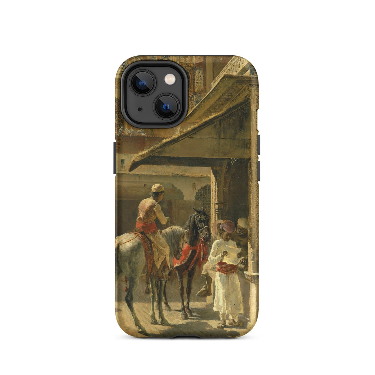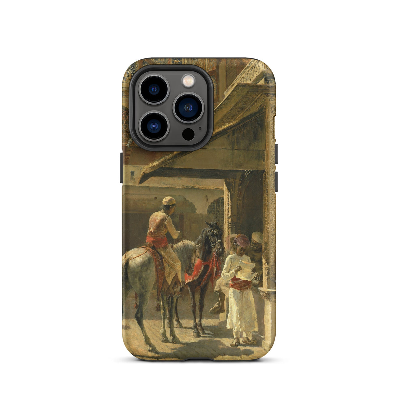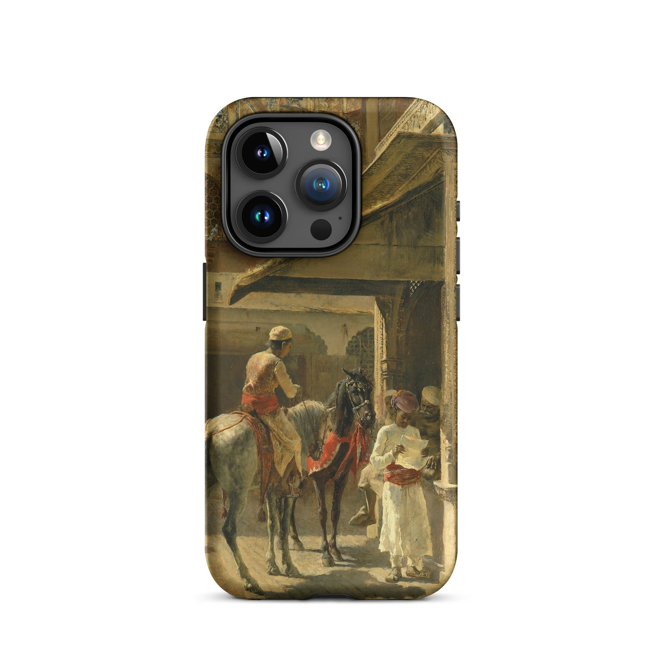 Een poort naar een verdwenen wereld—deze iPhone hoesje transformeert je apparaat in een artefact uit het koloniale tijdperk van India, versierd met Hindu Merchants door Edwin Lord Weeks. Hier, in een zonovergoten markt, pauzeert een bereden handelaar, zijn zilvergrijze ros gehuld in karmozijnrood. De getulbande koopman, gekleed in vloeiend wit, ontcijfert een brief—misschien een contract, een goederenboek, of nieuws uit verre landen. Boven hen staat Indo-Islamitische architectuur in prachtige details—weelderige gravures, ingewikkeld traliewerk, de grandeur van Mughal en Rajput vakmanschap die patronen van licht en schaduw werpen.