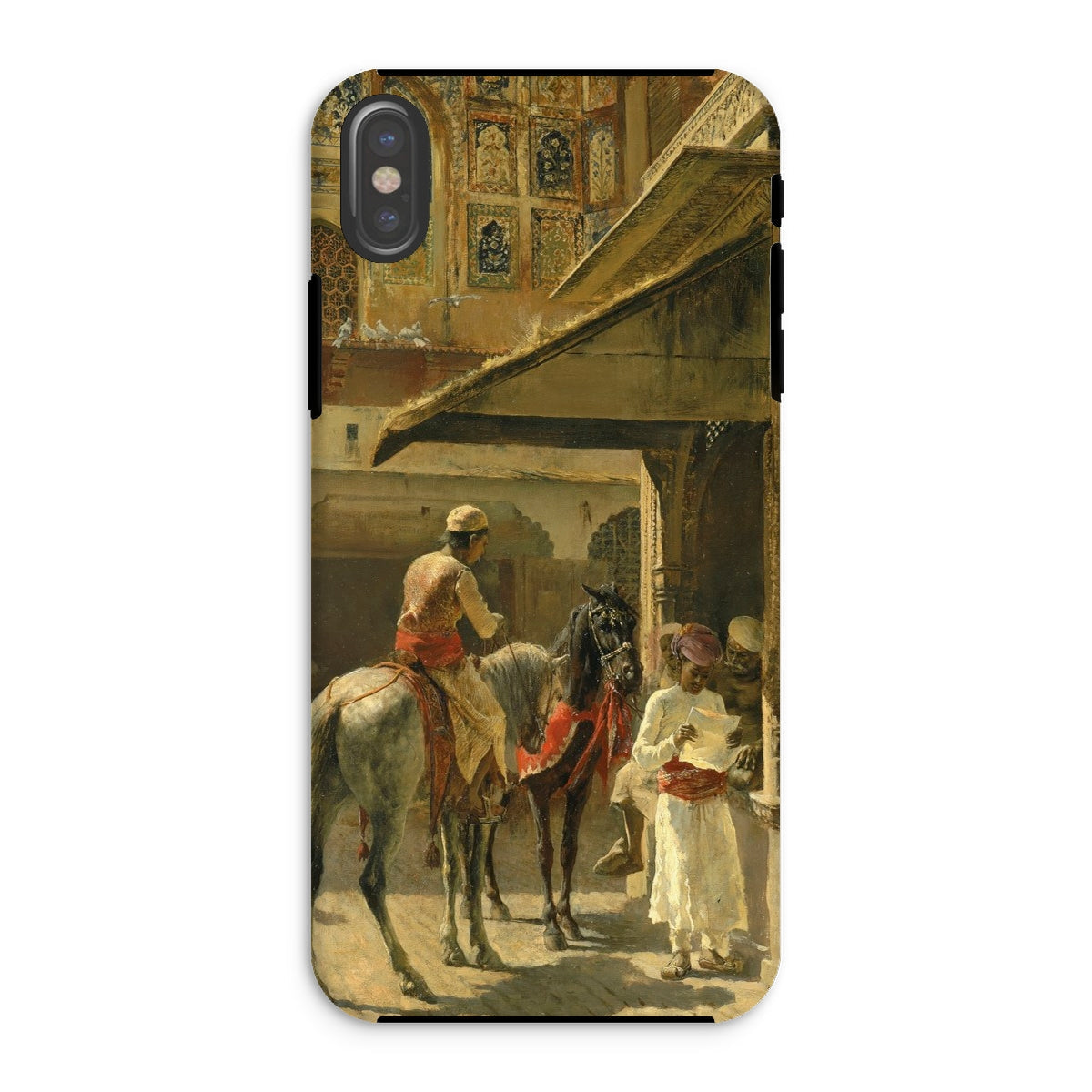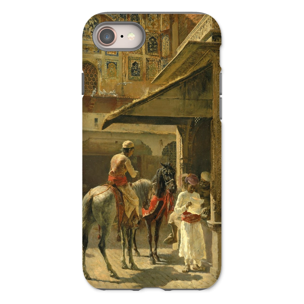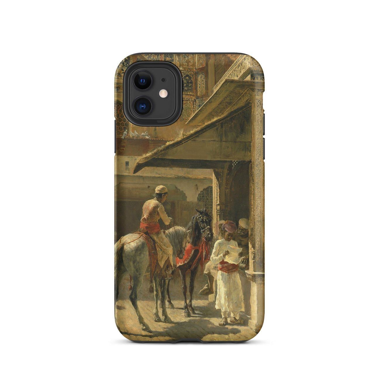 Een poort naar een verdwenen wereld—deze iPhone hoesje transformeert je apparaat in een artefact uit het koloniale tijdperk van India, versierd met Hindu Merchants door Edwin Lord Weeks. Hier, in een zonovergoten markt, pauzeert een bereden handelaar, zijn zilvergrijze ros gehuld in karmozijnrood. De getulbande koopman, gekleed in vloeiend wit, ontcijfert een brief—misschien een contract, een goederenboek, of nieuws uit verre landen. Boven hen staat Indo-Islamitische architectuur in prachtige details—weelderige gravures, ingewikkeld traliewerk, de grandeur van Mughal en Rajput vakmanschap die patronen van licht en schaduw werpen.