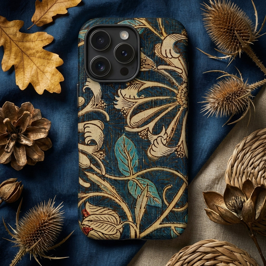 Duik in de bloemrijke fantasie van William Morris met deze iPhone hoes die allesbehalve alledaags is. Wervelende kamperfoelieslierten in rijk crème dansen over een middernachtblauw canvas, onderbroken door turquoise bladeren die oplichten als verborgen juwelen. Dit is niet zomaar een telefoonhoesje - het is een zakformaat portaal naar de esthetische rebellie van het Victoriaanse tijdperk.