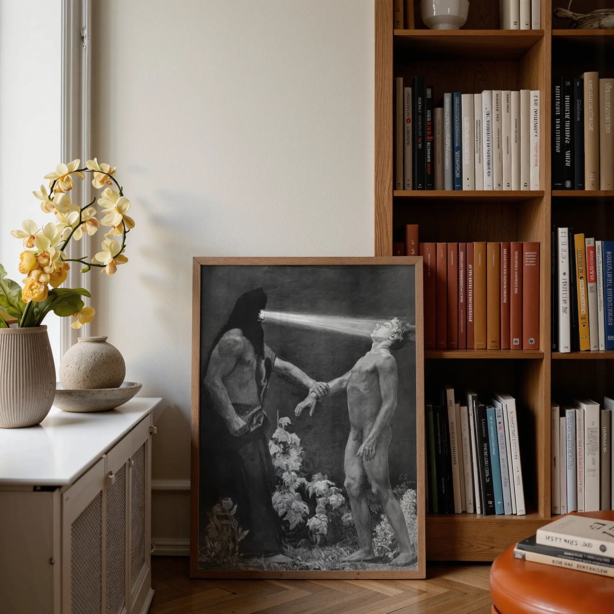 Twee mannen staan gevangen in een onzichtbare stroom—de een bevelend, de ander verzwolgen. Licht overbrugt hen, precies als een mes. De gehulde hypnotiseur straalt sculpturale zwaarte uit; zijn onderwerp, ontdaan van alles behalve de daad van ontvangen, gloeit van koortsachtige overgave.