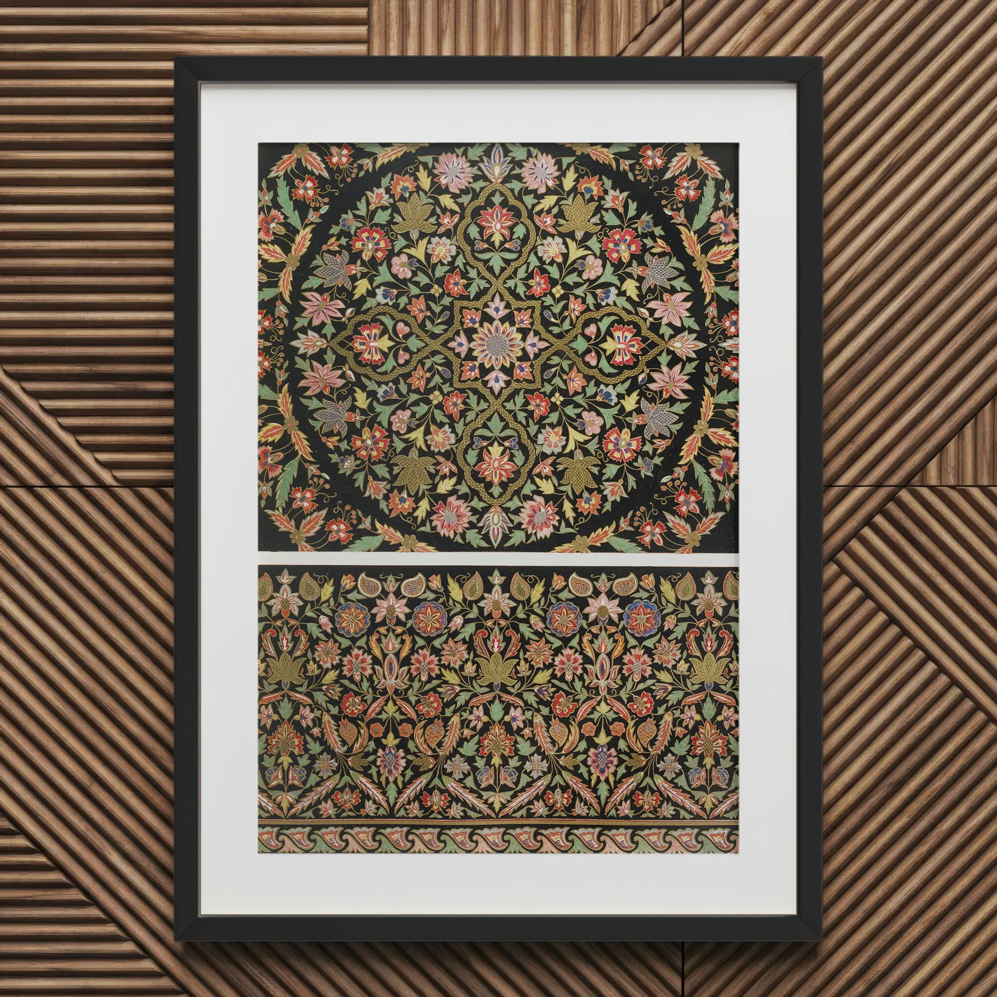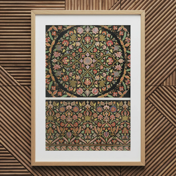 Deze Matthew Digby Wyatt kunstdruk vangt de essentie van 19e-eeuwse Indiase borduurkunst, een testament aan de subcontinentale pracht. Het roept de weelderige kamers van een Mughal-paleis op door middel van een verblindend tapijt van zijde en goud.