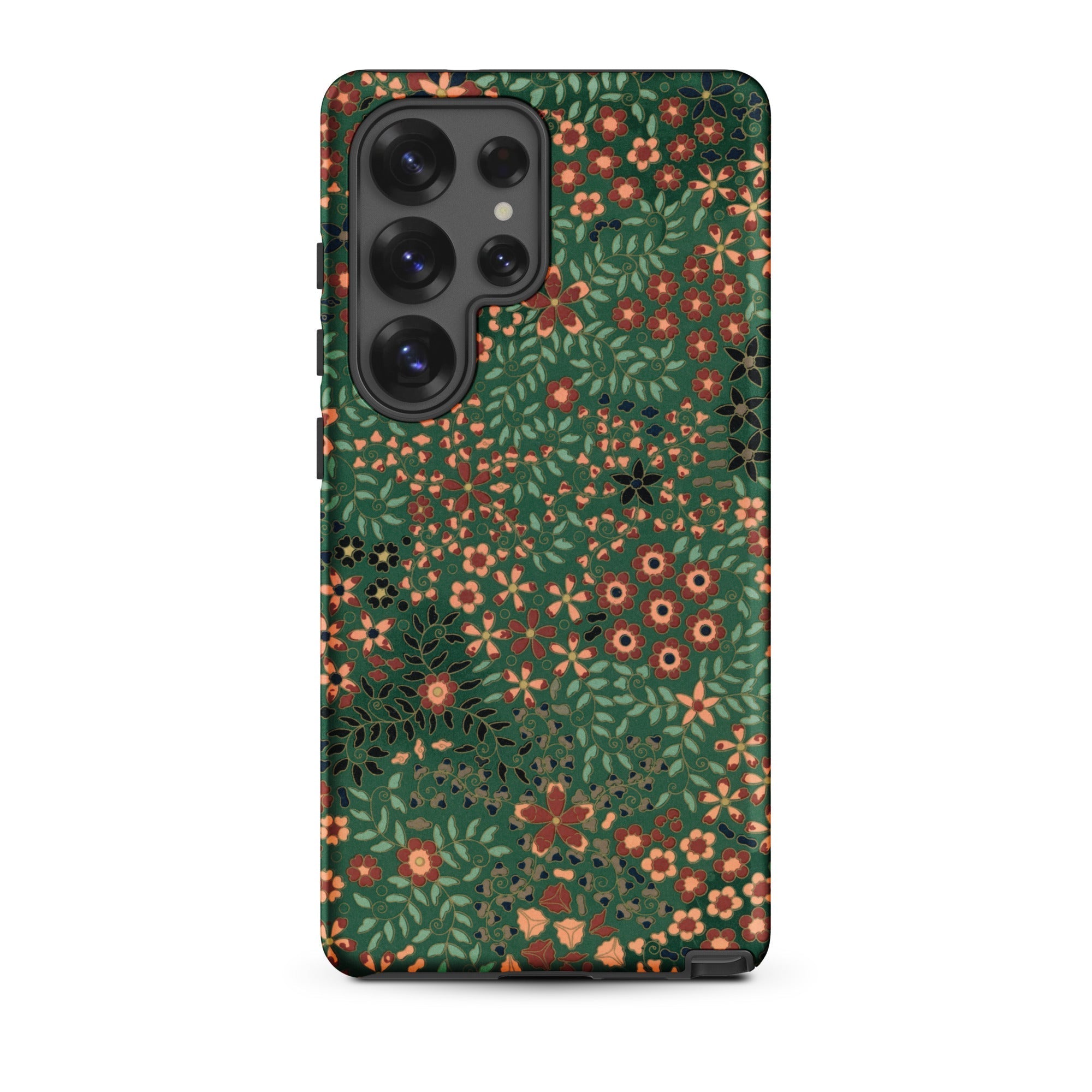 Je Samsung wordt een zakformaat vouwscherm, omhuld in de bloemrijke geometrie van G.A. Audsley's door Japan geïnspireerde patroonwerk. Clusters van vermiljoen- en kleikleurige bloemen stralen door een dicht raster van bladvormen, hun ritmische herhaling doet denken aan zijden kimono's en houtsnede-tuinen.