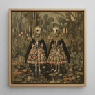 Twee figuren staan in de stilte van een vergeten wereld—Jenny en June, spookachtige tweelingen die ronddwalen in een surrealistisch gotisch landschap. Hun porseleinen gezichten zijn zonder uitdrukking, hun buitenaards zwarte ogen absorberen de stilte. Gehuld in Victoriaanse fantasieën, bloeien hun geborduurde rokken met echo's van de vreemde tuin om hen heen—rozen, doornen, herinneringen.