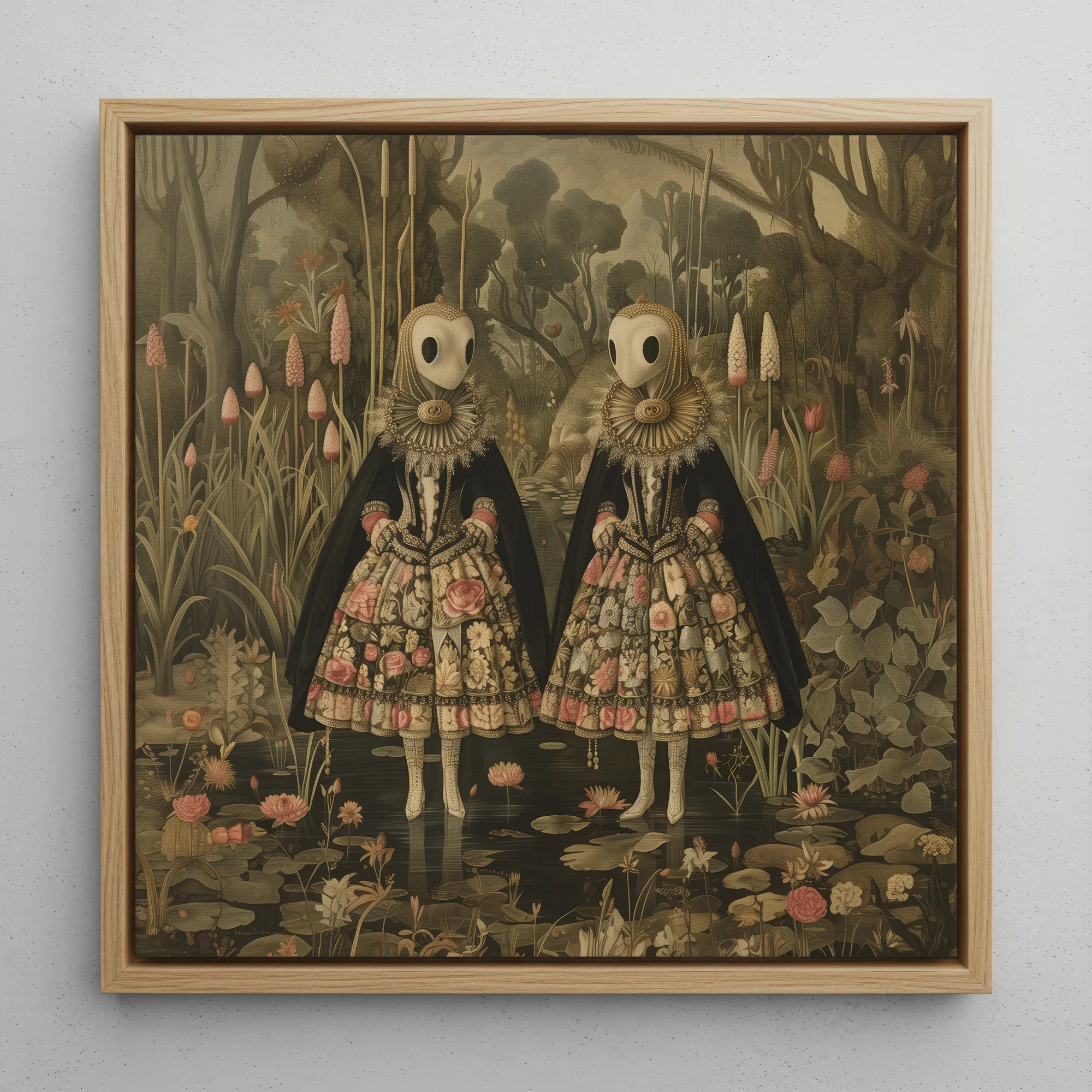 Het donkere water onder hen rilt, vervormt hun weerspiegelde vormen. Deze griezelig schattige tweelingen zijn een visioen—waar onschuld verstrengeld raakt met het verontrustende. Waar spookachtig mooie decoratie het onmogelijke ontmoet. Grillige horror esthetiek verweven met stille dreiging. Ze behoren noch tot het verleden, noch tot de sterren, maar tot het tussenin.