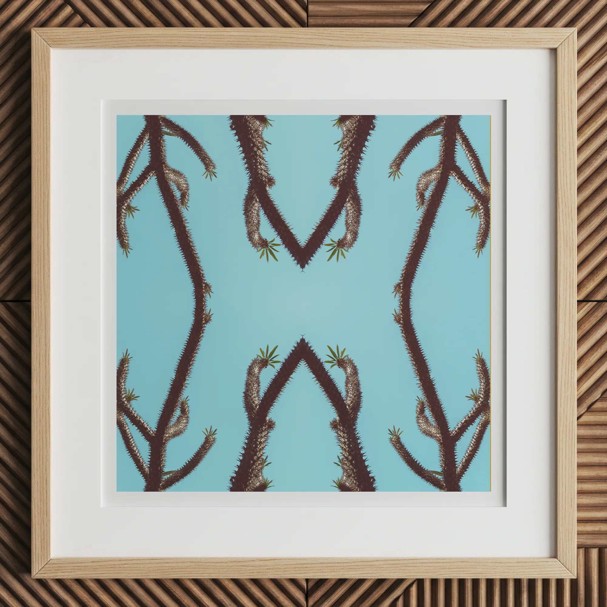 Dit hypnotiserende stuk lokt je naar een cerulean droomlandschap waar stekelige wachters een buitenaardse ballet uitvoeren. Gespiegelde symmetrie creëert een caleidoscopische draaikolk, die je oog langs stekelige silhouetten trekt die botanische normen tarten maar toch vreemd organisch aanvoelen.