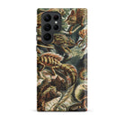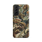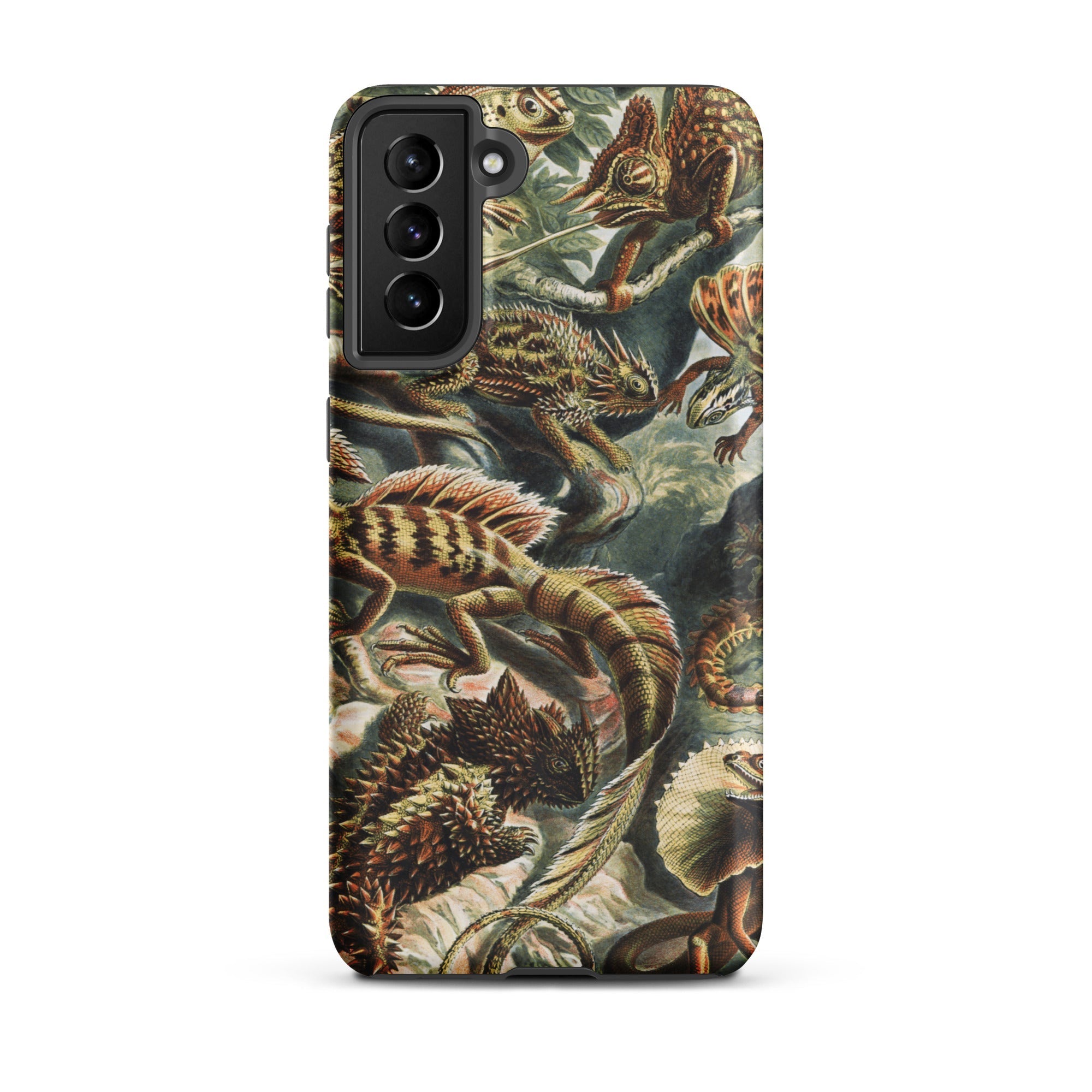 Een wemelend congres van geschubde lichamen krioelt over je Samsung-hoes, rechtstreeks overgenomen uit Ernst Haeckel's Lacertilia. Elke hagedis, gehoornd of gekuifd, kronkelt door de compositie met anatomische precisie en chromatische diepte. Stekelige staarten buigen als botanische ranken, klauwen grijpen onzichtbare zitstokken vast, ogen glinsteren met prehistorische waakzaamheid.