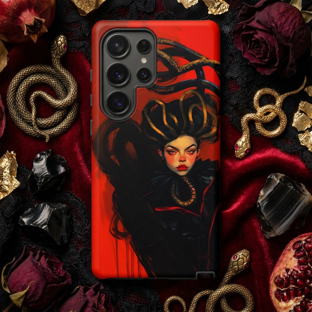 Haar blik slaat toe als obsidiaan gepolijst onder middernachtstormen, elke hoek van haar vorm gewikkeld in de koortsachtige spiraal van goudgeringde slangen. Inktzwarte ruches rijzen op bij haar keel, de scharlaken lucht opslokkend die tegen haar drukt.