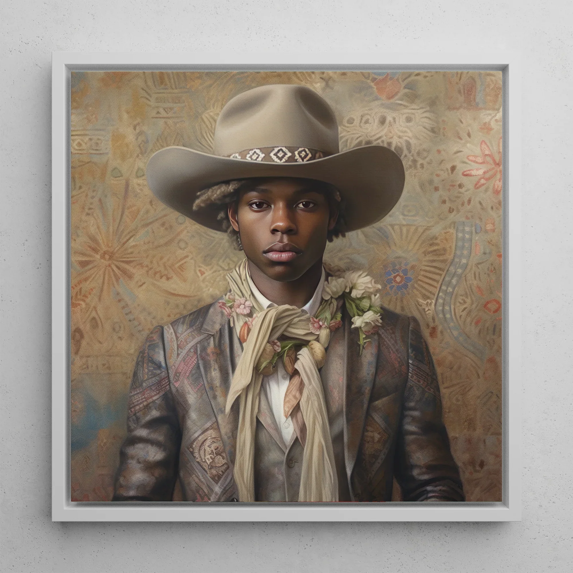 Achter hem zwaait de geschilderde woestijnachtergrond met de sepia-getinte echo's van verloren paden, een spectraal quilt van West-Afrikaanse textiel motieven en cowboycartografie. Hier, in deze liminale ruimte tussen verleden en toekomst, staat Lysander ongebroken—een soevereine figuur in de mythos van het queer zwarte Westen.