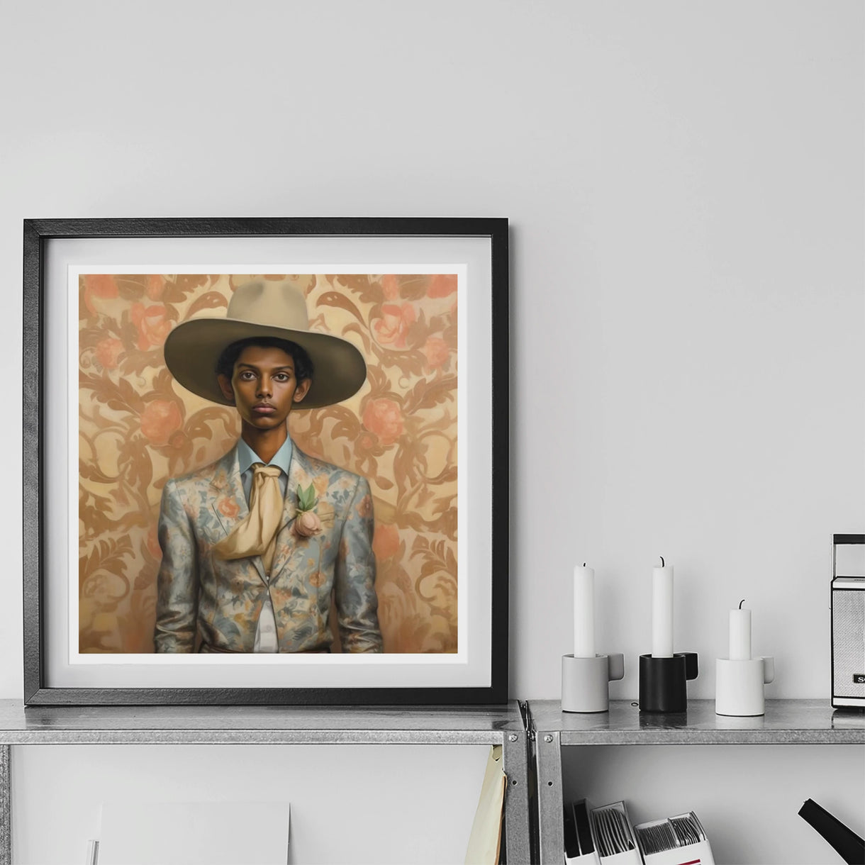Achter hem ademt het behang—bloemendamast ontvouwt zich als Kolam-patronen en Art Nouveau bloeit bij zonsopgang—stille spreuken uitgesproken in oker en koraal. Dit is geen gewoon cowboyverhaal; Mallaravan's is een herovering. De westerse grens en Tamil-identiteit verstrengelen zich in zijn botten, in zijn houding, in de manier waarop hij zowel tederheid als ruimte commandeert. Hij is een veeran van twee werelden, een buitenstaander van verwachting, een storm vogel, vormveranderaar, legende.