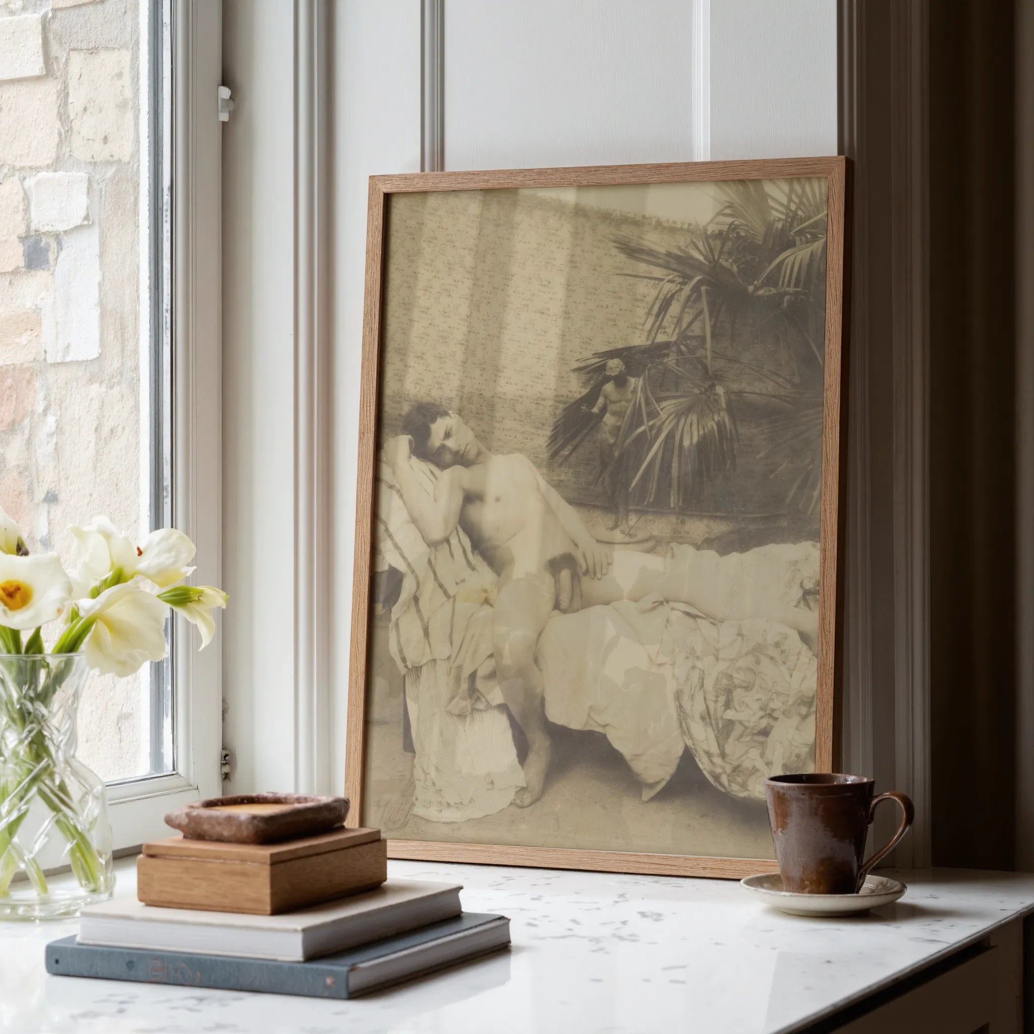 Deze sepia-uitwaseming van huid en steen, Vincenzo Galdi's 19e-eeuwse lens—een alchemie van schandaal en sereniteit—arresteert de tijd binnen de satijnen stilte van deze jongensachtige Adonis. Zijn arm geeft toe aan de aandrang van het laken, half gesmolten door slaperig licht, terwijl een tweede figuur—een heraut of een geest—opduikt uit de pluimen van tropisch gebladerte achter hem.