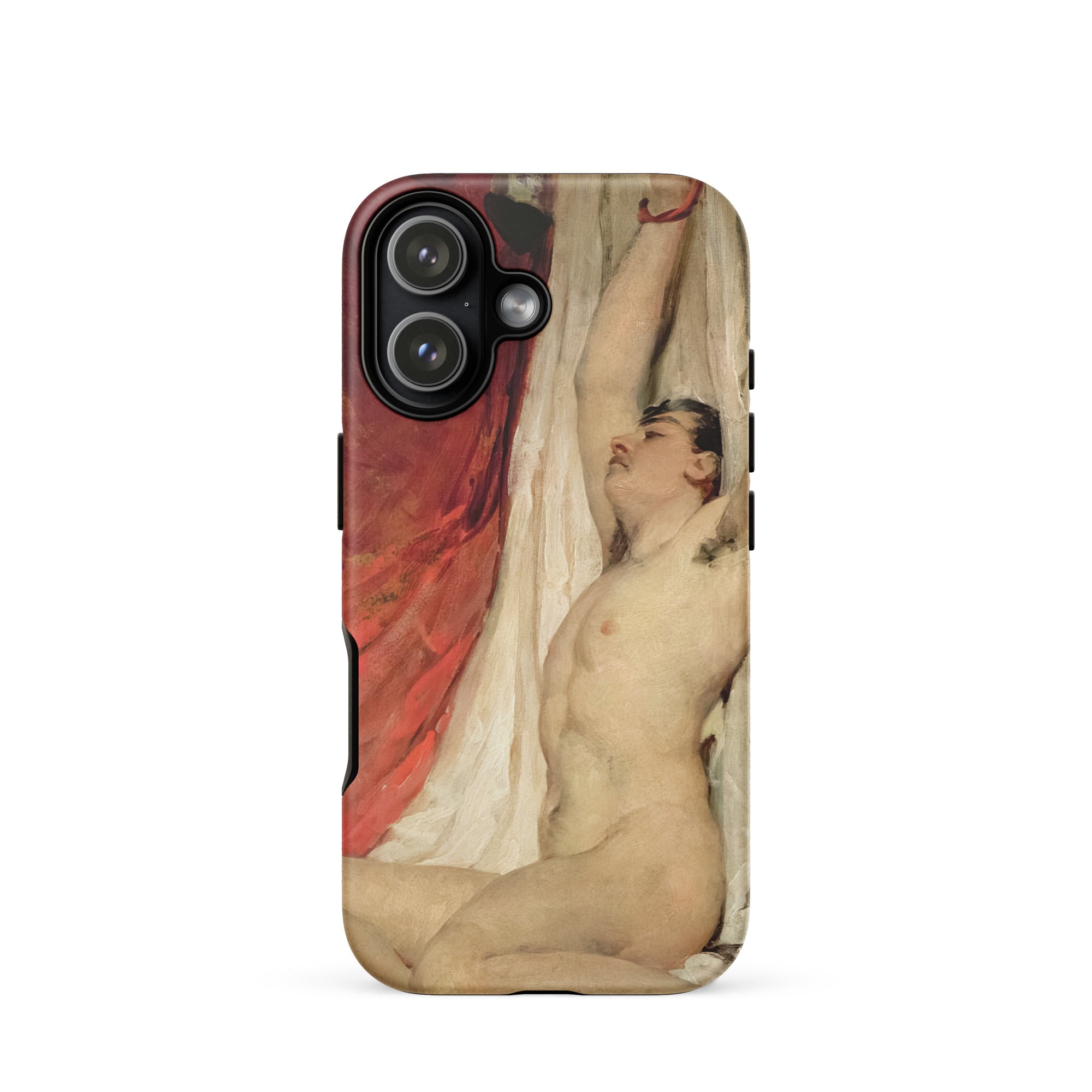 Een storm van vlees en stof, William Etty's neoklassieke olieverfschilderij barst los op deze fijne kunst iPhone hoes, waar de mannelijke vorm zowel gevangen als triomfantelijk is. Zijn albasten huid steekt af tegen een waterval van karmozijnrode en ivoorkleurige draperieën, weergegeven in het sensuele chiaroscuro van de Romantiek. Een BDSM echo van de Grand Manner traditie, waar geschiedenis, mythologie en menselijke kwetsbaarheid met elkaar verweven zijn.