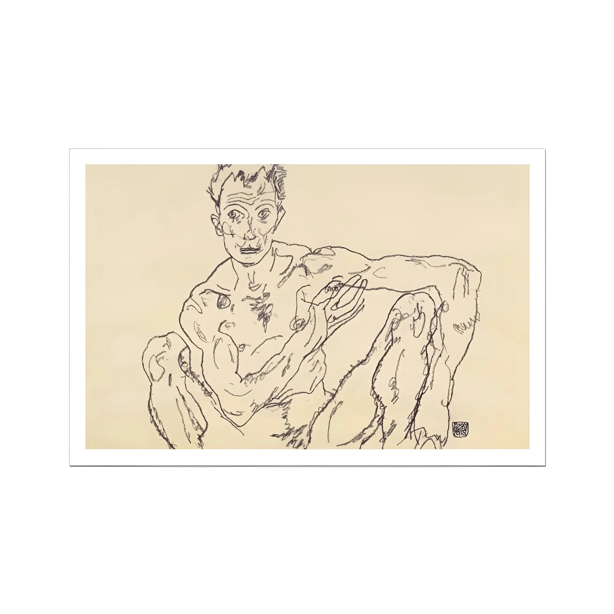 Het vlees is gekrast, niet gevormd. Ledematen draaien in een geometrie van voyeurisme, boetedoening geslepen tot stijl. De ogen filmen je blik in ruil daarvoor. En Schiele tekent zichzelf als belichaming van breuk: geen man, geen martelaar, maar artefact van erotische breuk. Het is een portret van mannelijke opwinding - heidens, punk, onberouwvol. Vlees in kaart gebracht als een koortsdroom op de rand van zijn eigen ondergang.