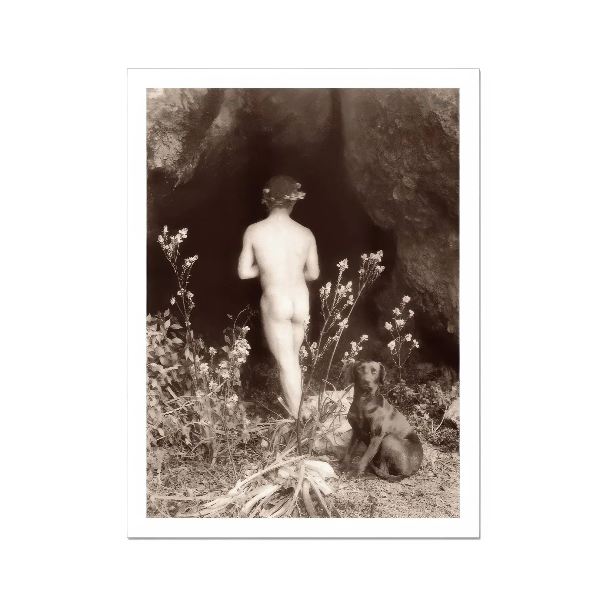 In "De man die een grot binnenkomt van Wilhelm von Glenden, worden we vervoerd naar een scène doordrenkt van mythische resonantie en natuurlijke schoonheid. De jonge man, zijn rug naar de kijker, streeft vol vertrouwen in de richting van de schaduwde ingang van een grot. Zijn kale vorm verlicht In zachte, sepia -tonen die een gevoel van tijdloosheid oproepen. om hem heen, delicate wilde bloemen en groene gebladerte zijn pad omlijsten, terwijl een loyale hond in een rustige waakzaamheid in de buurt zit, wat een vleugje huishoudelijke bekendheid toevoegt aan het anders etherische tableau.
