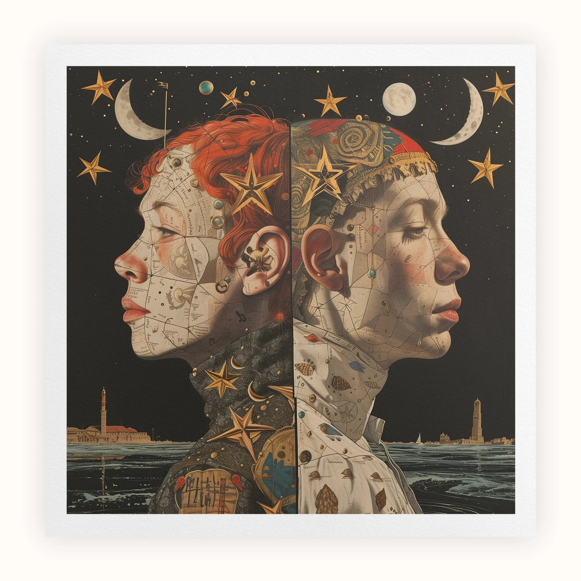 Tweelingzielen uit sterrenstof gesneden, hun gezichten geëtst met hemelse kaarten—"Nachtegalen" fluisteren van lot, liefde en de onzichtbare draden die binden. Een kosmische ballet ontvouwt zich: de een baadt in zonnevuur, de ander in maanlicht, hun spiegelprofielen gescheiden door tijd maar samen geweven door bestemming. De nachtelijke hemel wiegt hen, sterren verstrengeld in hun haar, planeten die hun stille verlangen omcirkelen. Lesbische tweeling symboliek zoemt onder de oppervlakte, een ode aan verwante geesten die ruimte en tijd trotseren.