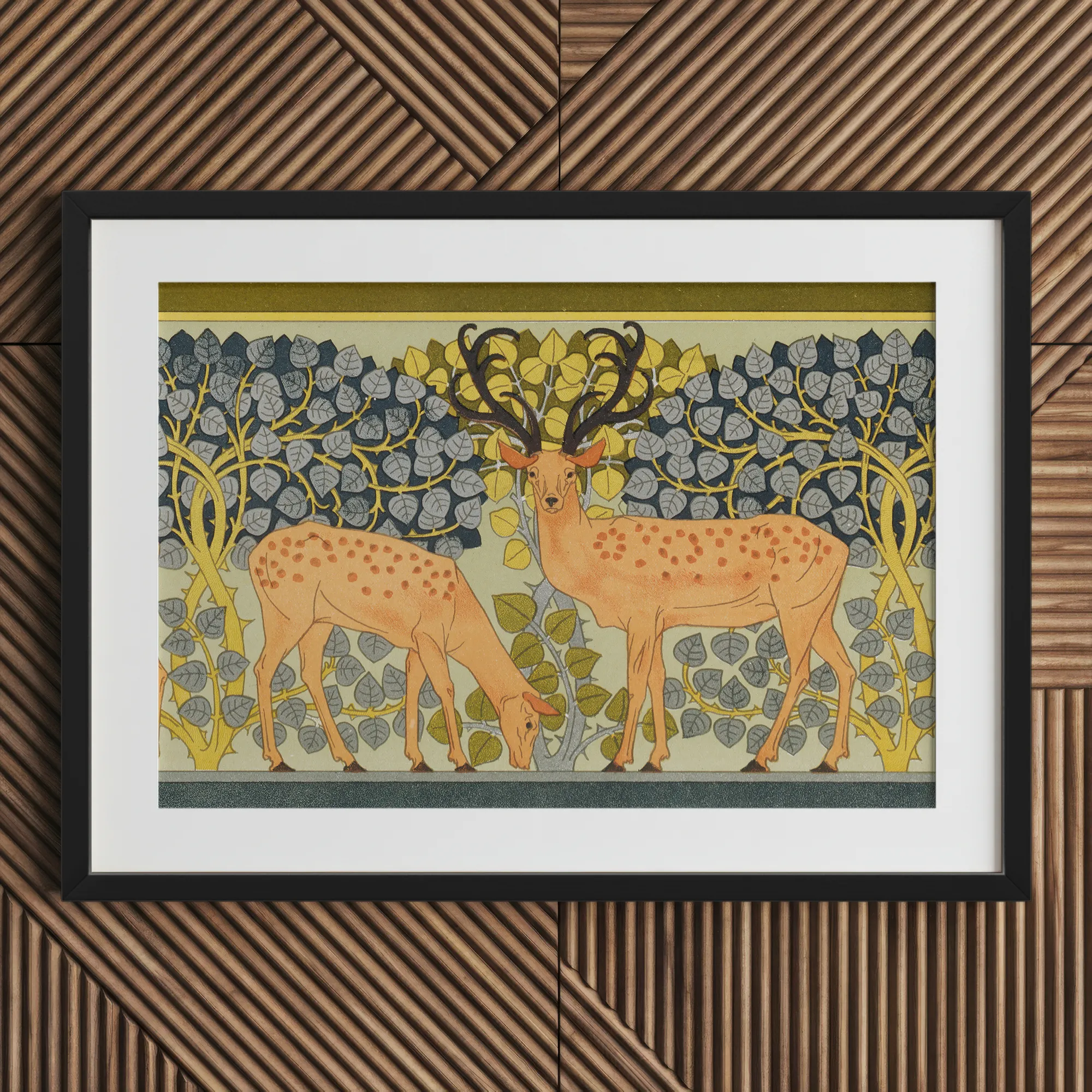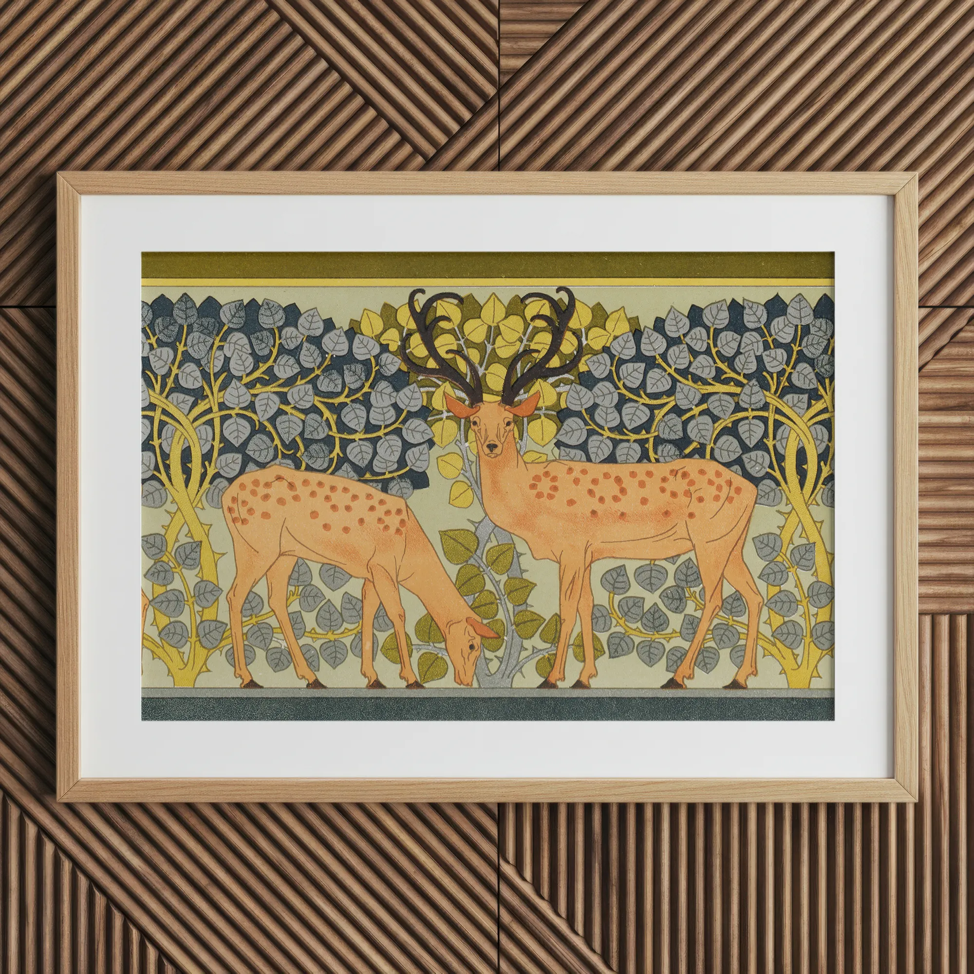 Verlies jezelf in dit droomlandschap - waar de geometrie van de natuur opnieuw wordt bedacht door een artistiek prisma. De illustratie van Verneuil siert niet alleen; Het wenkt je in een rijk waar cervine genade en botanische uitbundigheid harmoniseren in tijdloze elegantie.
