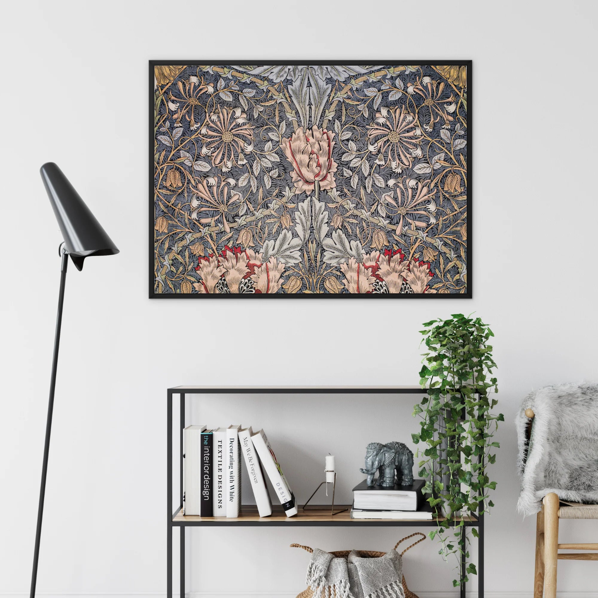 Morris's genialiteit voor botanische symboliek ontvouwt zich voor je ogen, met elk bloemblad en rank zorgvuldig weergegeven in gedempte aardetinten en zachte pastels. Het ingelijste canvas transformeert je ruimte en doordrenkt het met de tijdloze elegantie van Morris's textielkunst. Zie hoe de ritmische herhaling van kamperfoelie-motieven een betoverende visuele symfonie creëert, die je blik uitnodigt om door het dichte gebladerte te dwalen.