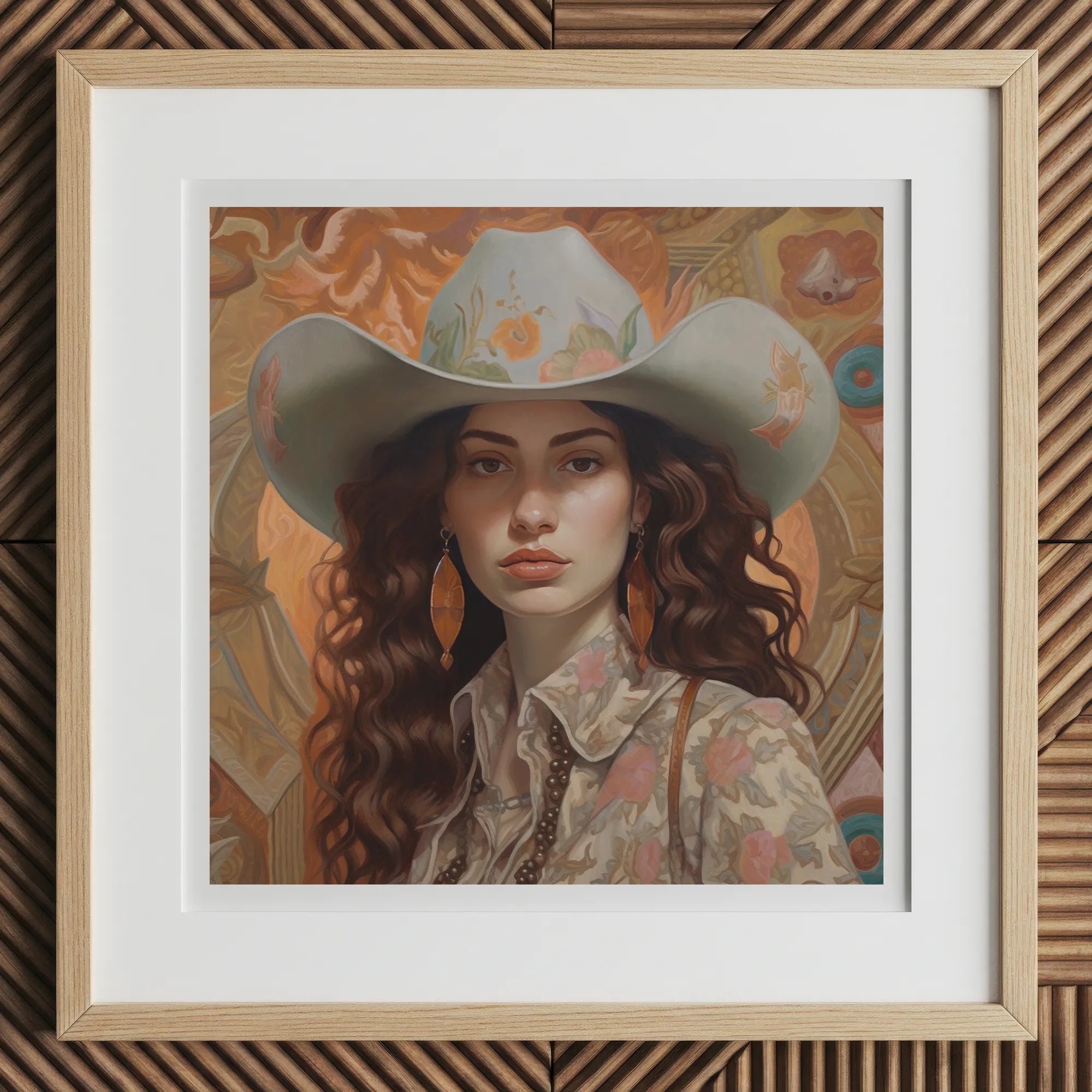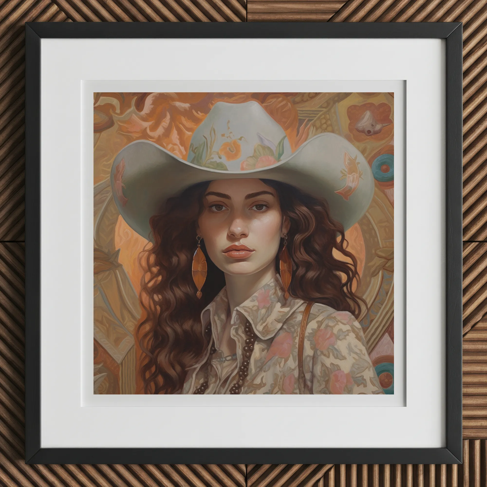Haar Stetson, schuin gedragen, is meer dan schaduw—het is een nalatenschap. Ooit reden Sefardische vaqueros onder dezezelfde luchten, hun gebeden dreven als stof in de hitte. Ze draagt hun echo's in het borduurwerk langs de rand, kleine Davidsterrenmotieven verborgen tussen de woestijnbloemen, een stille uitdaging tegen een wereld die hen probeerde uit te wissen.