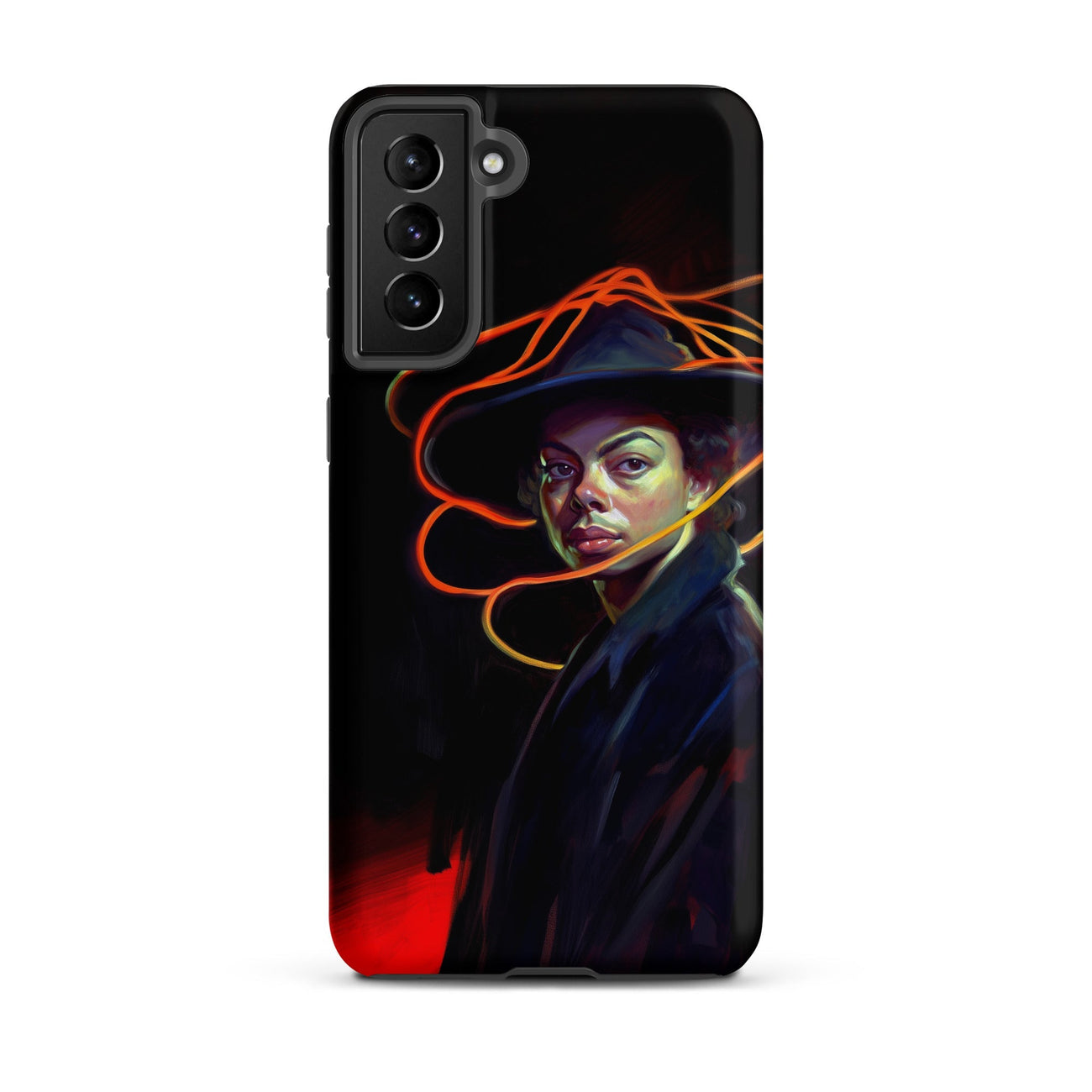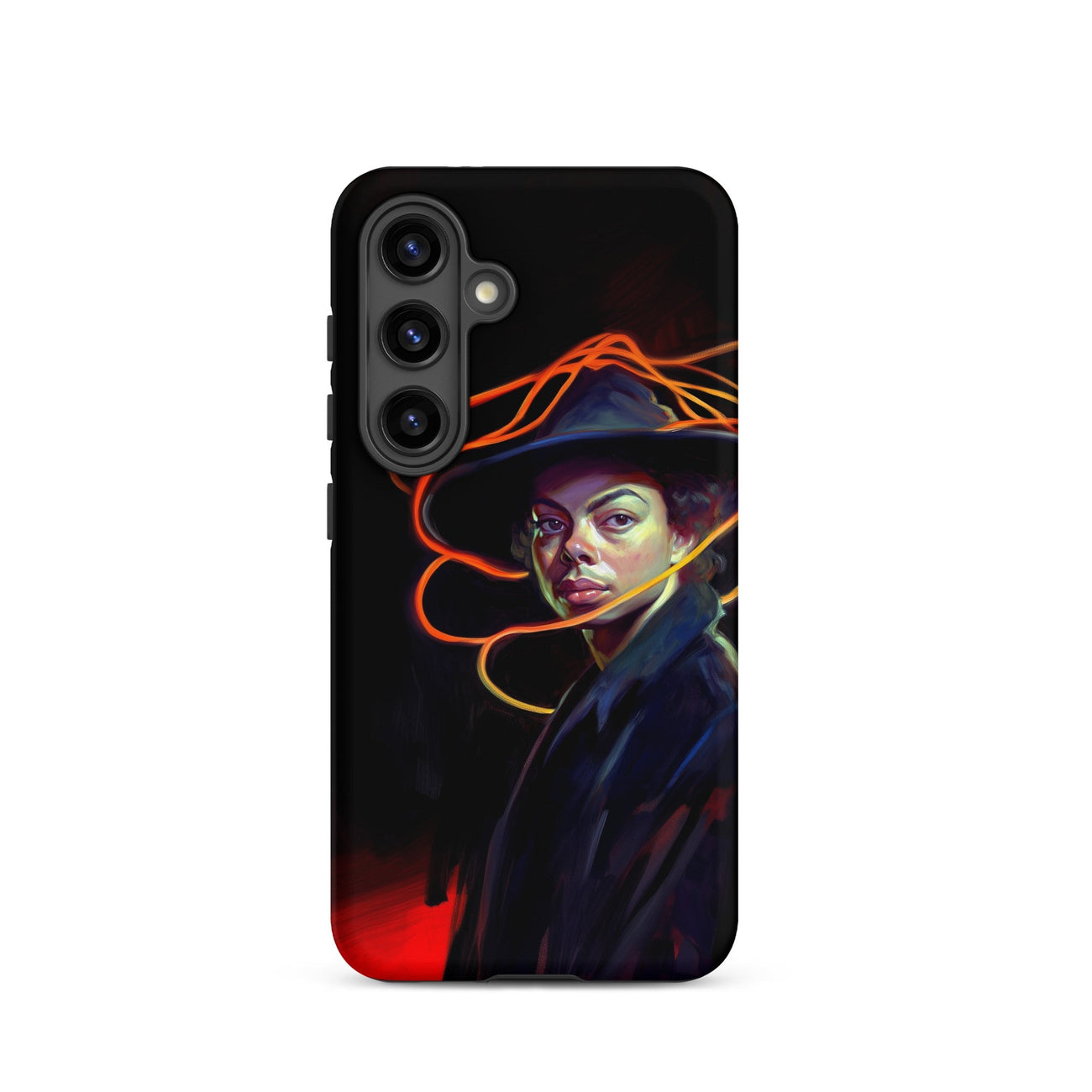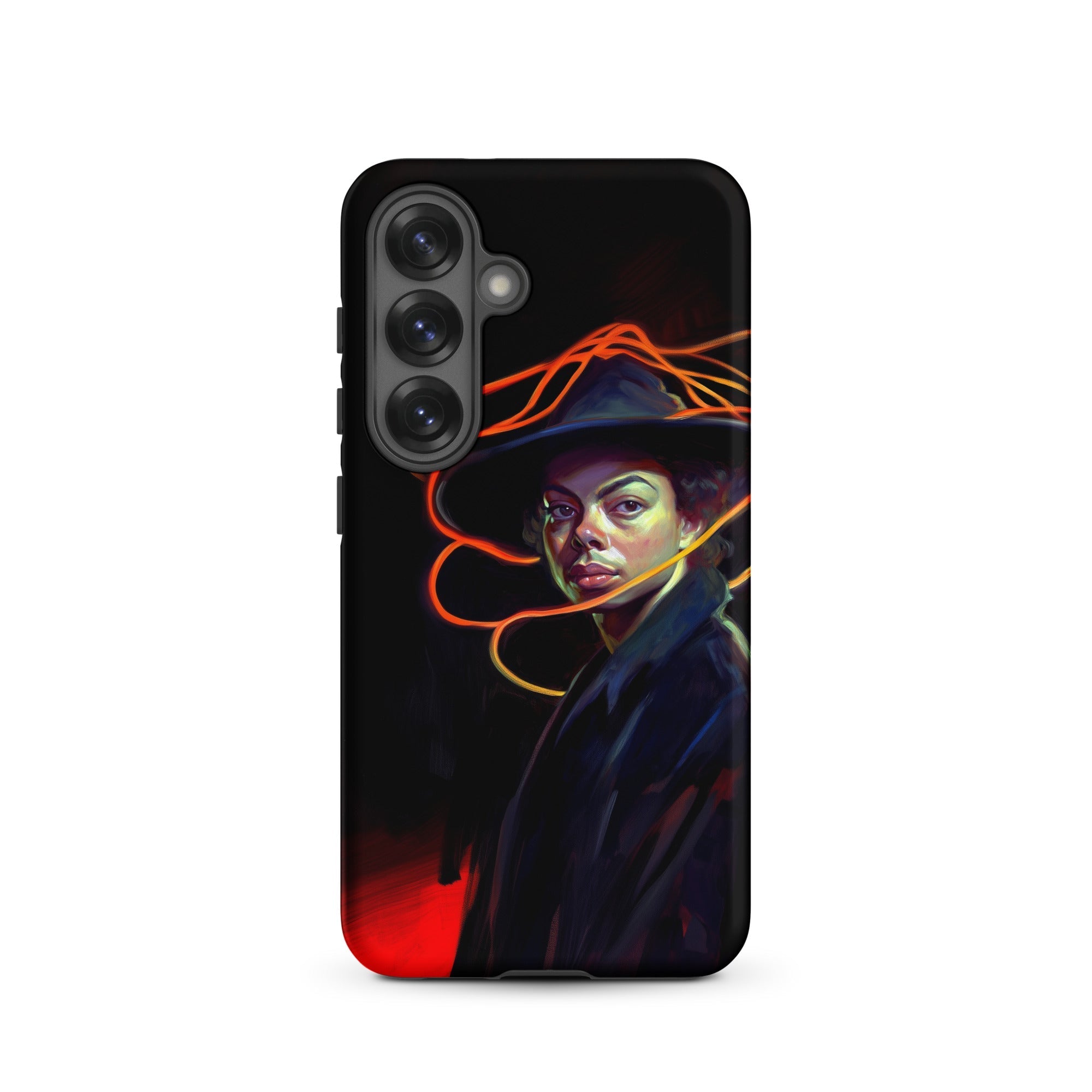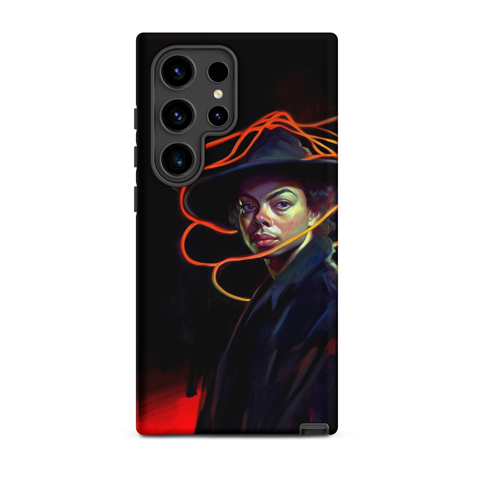 Nacht stroomt over hun schouder in penseelstreken van inkt en gloed, de rand van hun hoed snijdt de duisternis als een geheim dat te lang bewaard is gebleven. Neon filamenten kronkelen om hen heen—gesmolten lussen die zoemen met heksenlicht en onuitgesproken pacten.