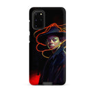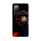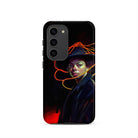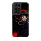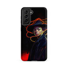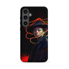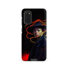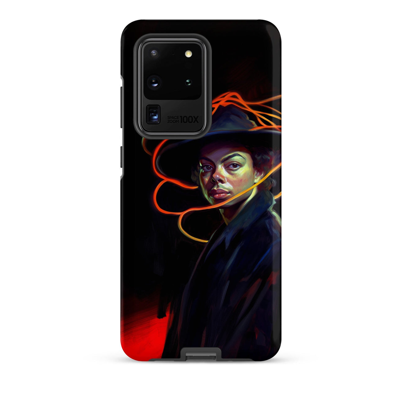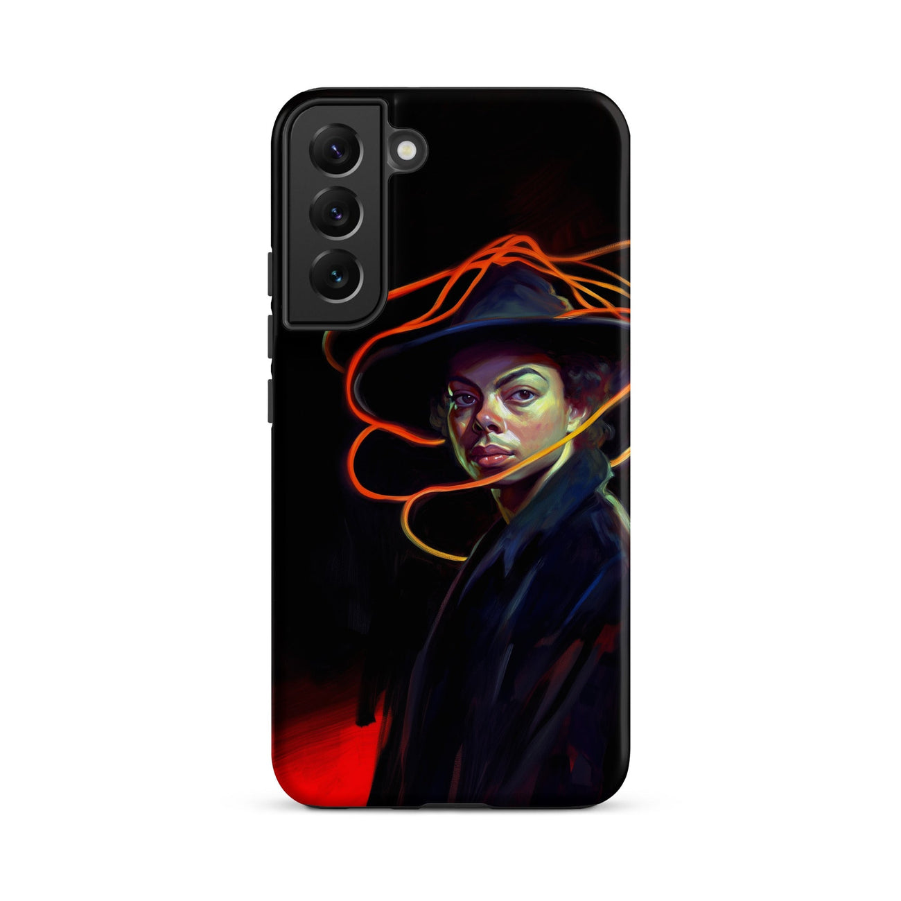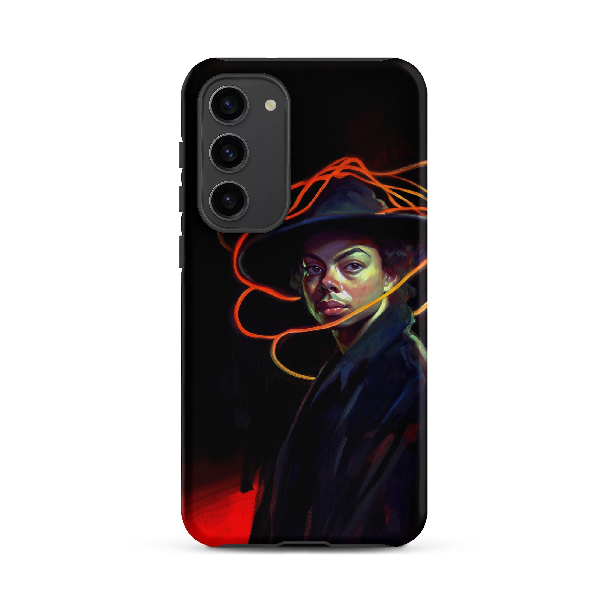 Nacht stroomt over hun schouder in penseelstreken van inkt en gloed, de rand van hun hoed snijdt de duisternis als een geheim dat te lang bewaard is gebleven. Neon filamenten kronkelen om hen heen—gesmolten lussen die zoemen met heksenlicht en onuitgesproken pacten.