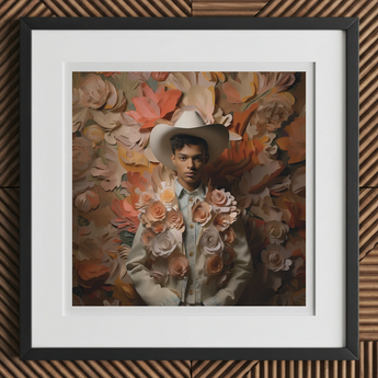 Pascal staat schitterend, een visie van zwarte queer cowboy majesteit, gehuld in een storm van gebeeldhouwde rozen. Zijn parelwitte Stetson—een kroon van verzet, knikkend naar de zwarte femboy zwerfers die tederheid weefden in de ruw gesneden mythologie van het Westen. Onder de rand smeult zijn blik met de wetende ondeugd van een balzaalicoon die klaar is om onder het neon van een lege snelweg te duiken.