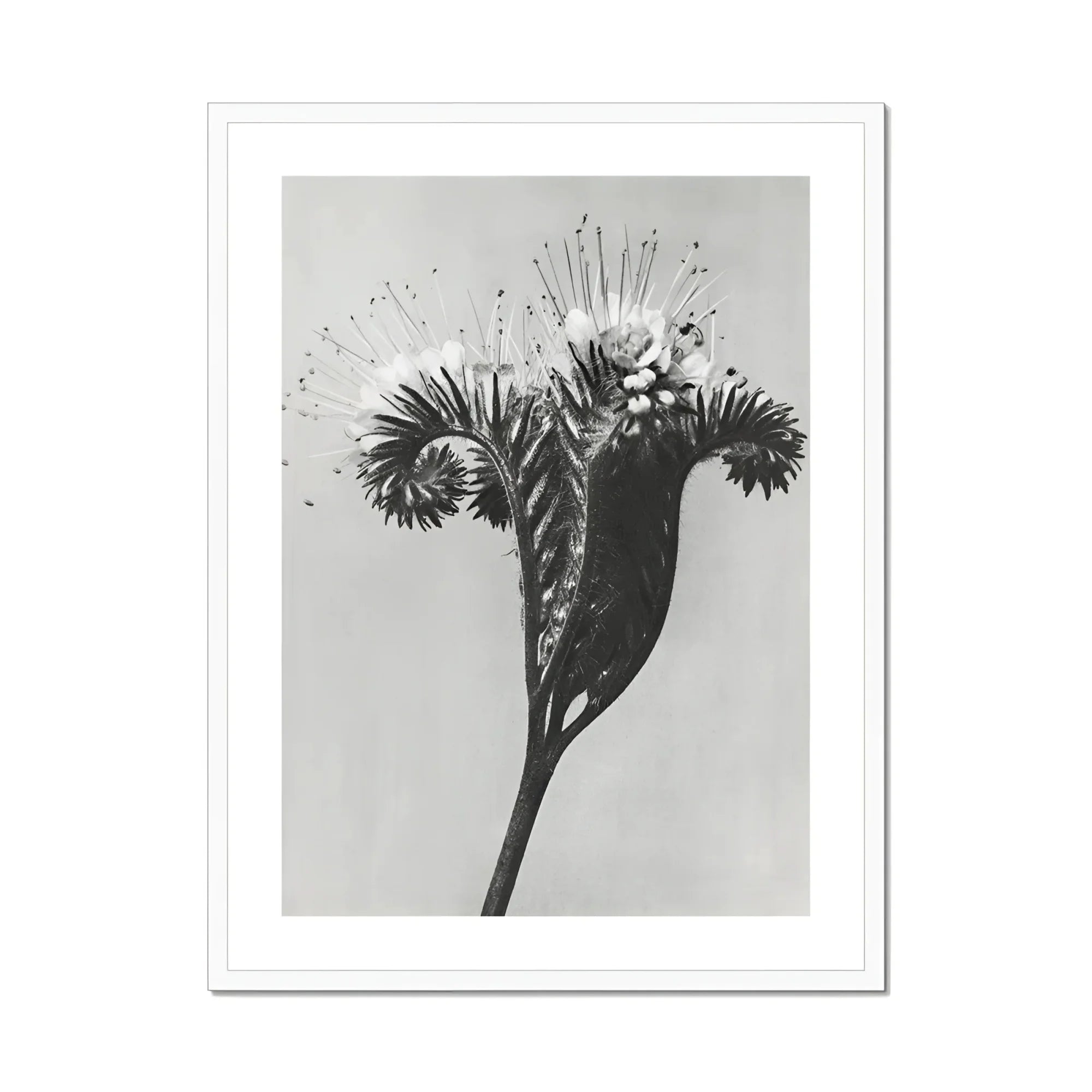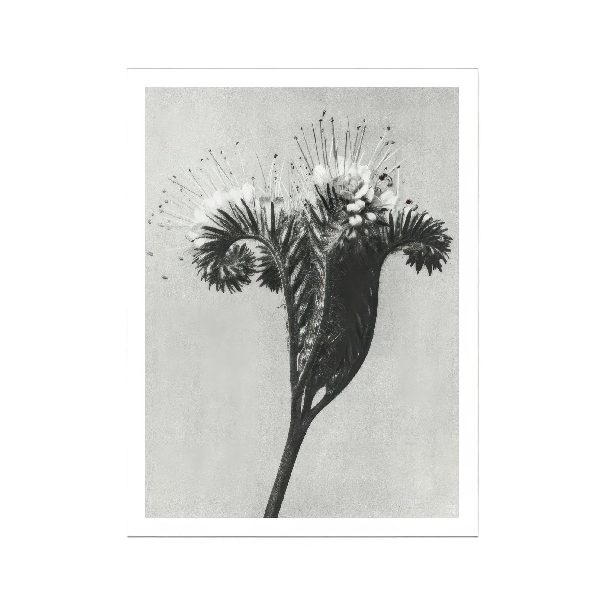 Feest je ogen op deze wonderbaarlijke Karl Blossfeldt -foto die de ingewikkelde schoonheid van Phacelia tanacetifolia vastlegt, ook bekend als Lacy Phacelia. Deze zwart-witte print onthult de buitenaardse structuur van de plant en transformeert het gewone in buitengewone kunst.
