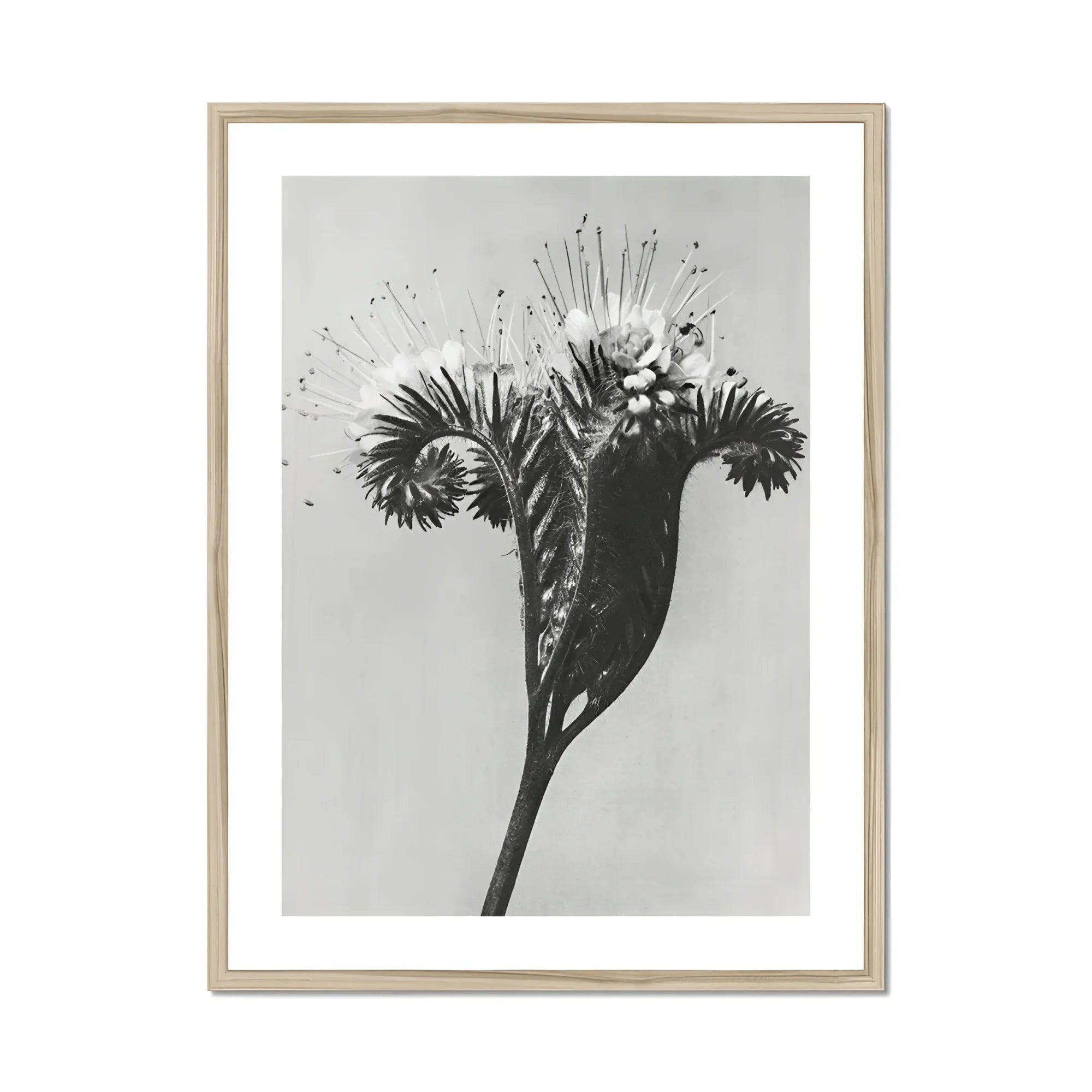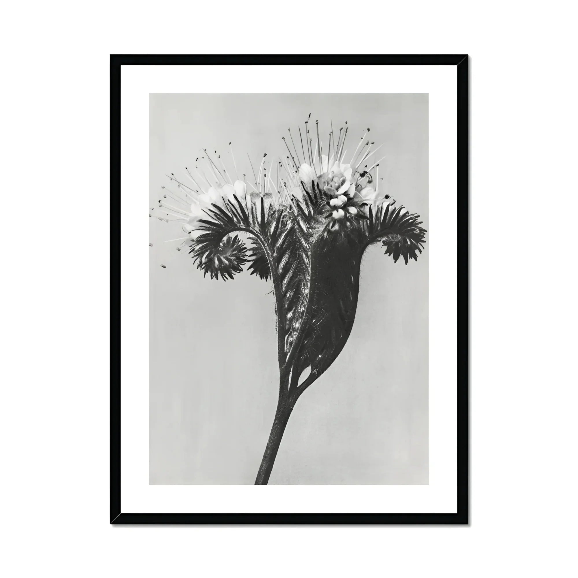 De meesterlijke lens van Blossfeldt vergroot de delicate opgerolde bloeiwijze van de bloem en onthult een buitenaardse vorm die zowel bizar als boeiend is. De spiraalvormige ranken en gevederde bladeren creëren een hypnotische dans van licht en schaduw, die beelden van surrealistisch oproepen zee wezens of kosmische fenomenen. Terwijl je jezelf verliest in de wervelende patronen en stekelige uitsteeksels, ontdek je een nieuwe waardering voor de complexiteit verborgen in de kleinste details van de natuur.
