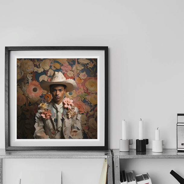 Presley staat in een bloei van wilde bloemenmagie. Een homoseksuele zwarte twunk gehuld in florale harnas. Zijn breedgerande hoed versierd met zachte, handgemaakte bloemblaadjes. Bekroont hem als een vorst van woestijndromen. Heerser over een rijk waar vrijheid ongeremd bloeit. Zijn blik, standvastig en doordacht, spreekt van een innerlijk landschap in kaart gebracht door zelfontdekking—een atlas van expressie geweven uit de geschiedenis van Buffalo Soldiers, Mardi Gras queer personen, en de ondergrondse gevechten waar zwarte twunk krachtpatsers hun eigen podium creëerden.