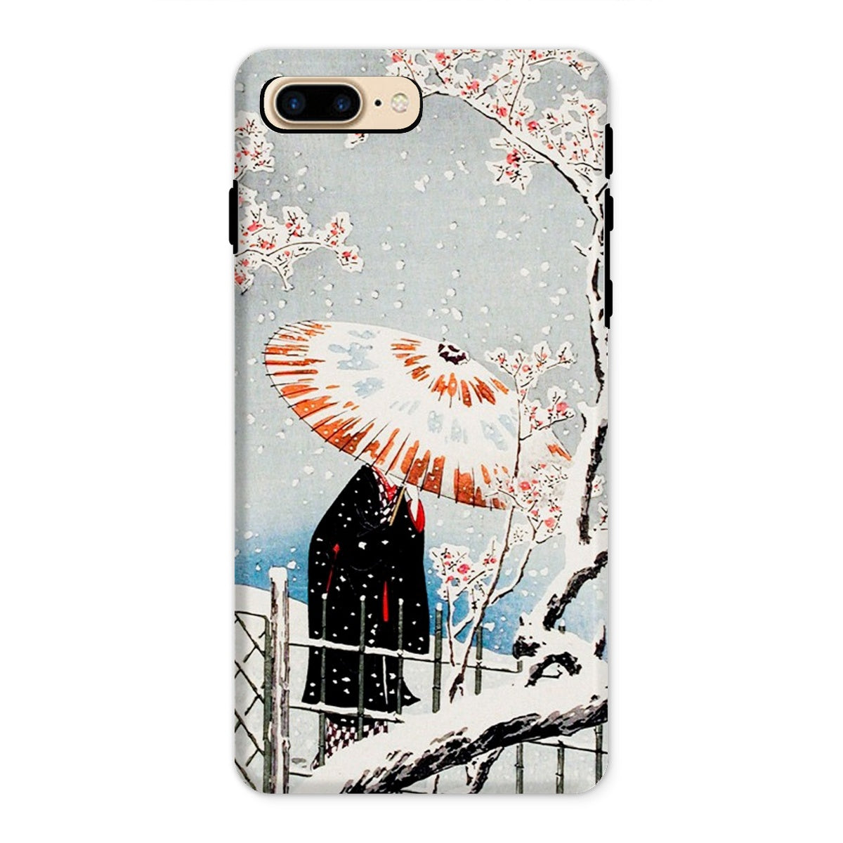 Terwijl je vingers de contouren van deze zaak traceren, voel je de stille kracht van de kimono-beklede figuur, beschut onder een traditionele paraplu van oliepapier. De vakkundig weergegeven Woodblock -printtechniek brengt de zachte sneeuwval en de frisse winterlucht tot leven. Dit is niet alleen een telefoonhoesje; Het is een portaal voor het rijke artistieke erfgoed van Japan.