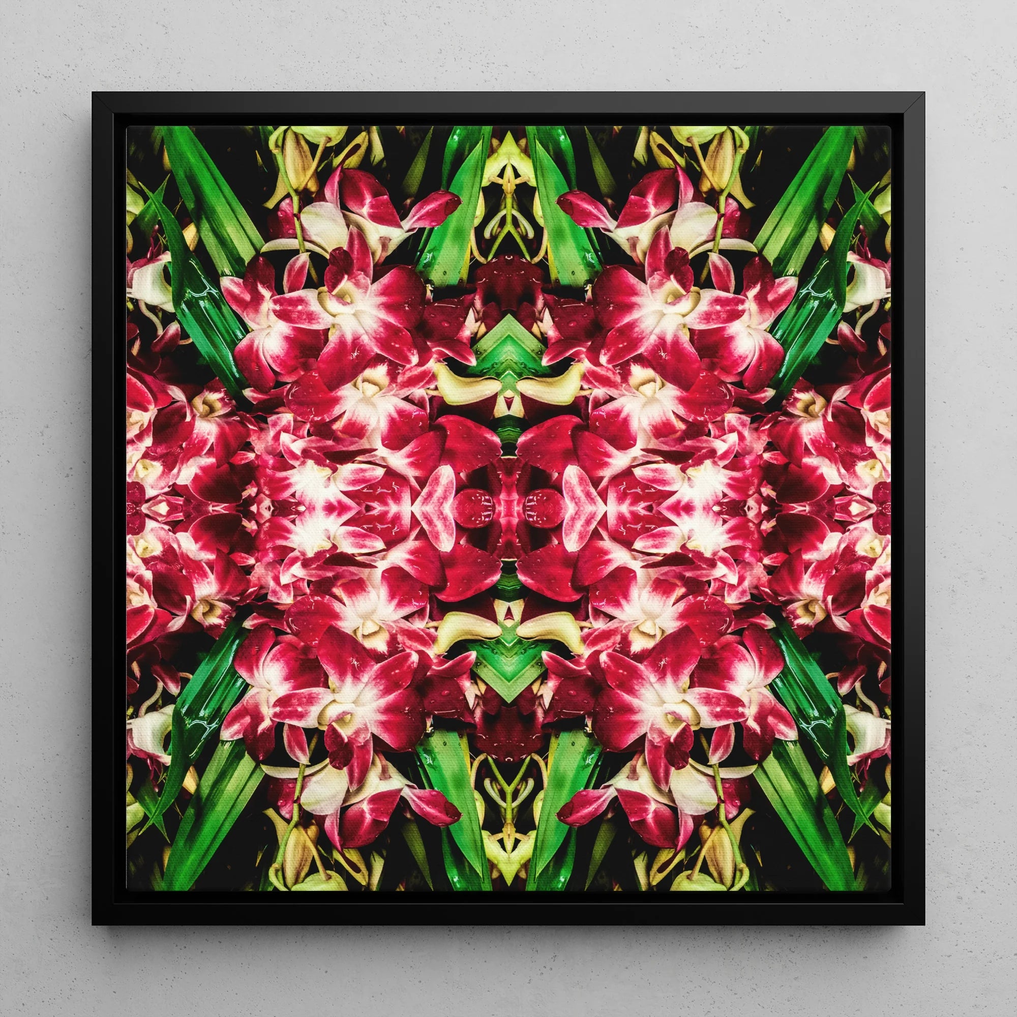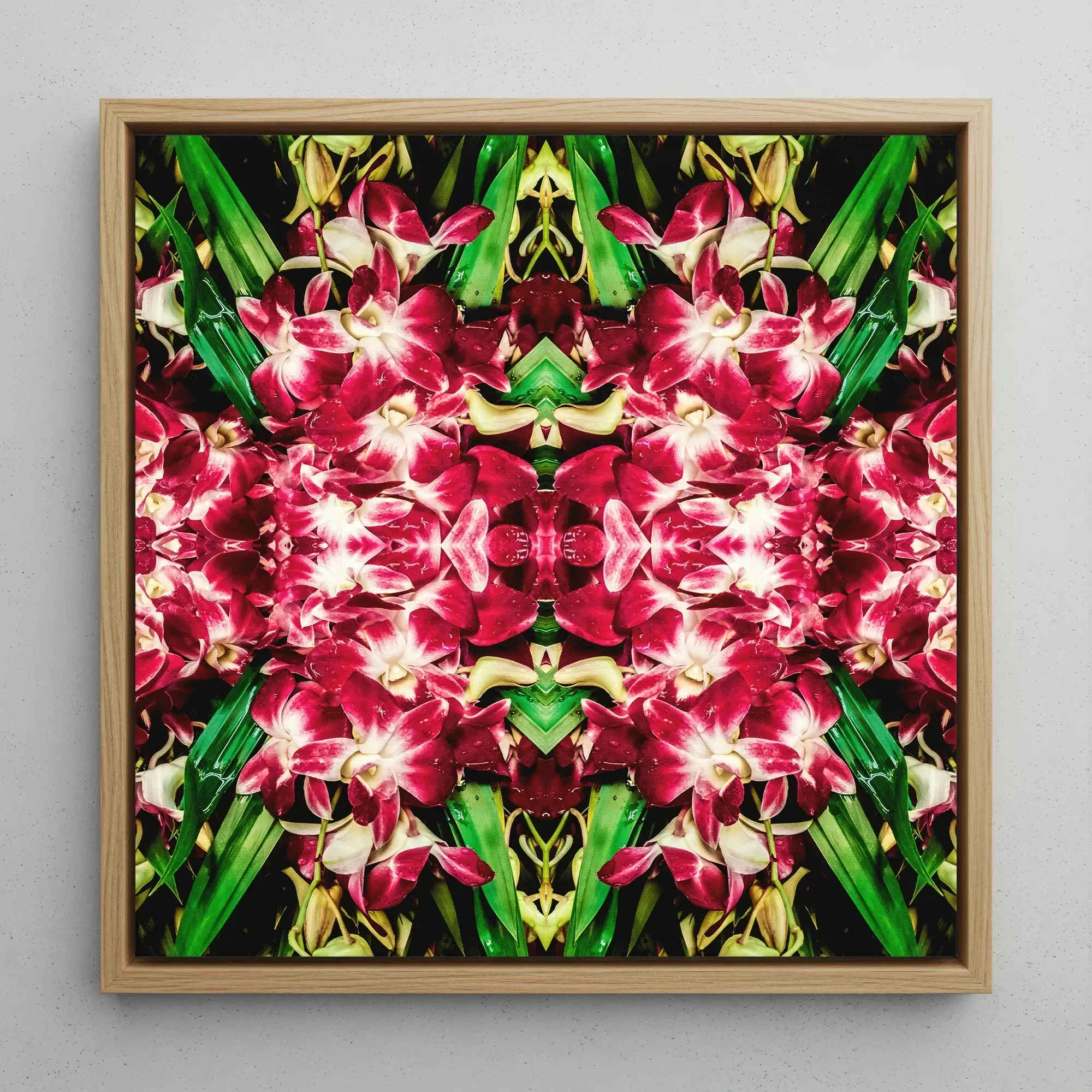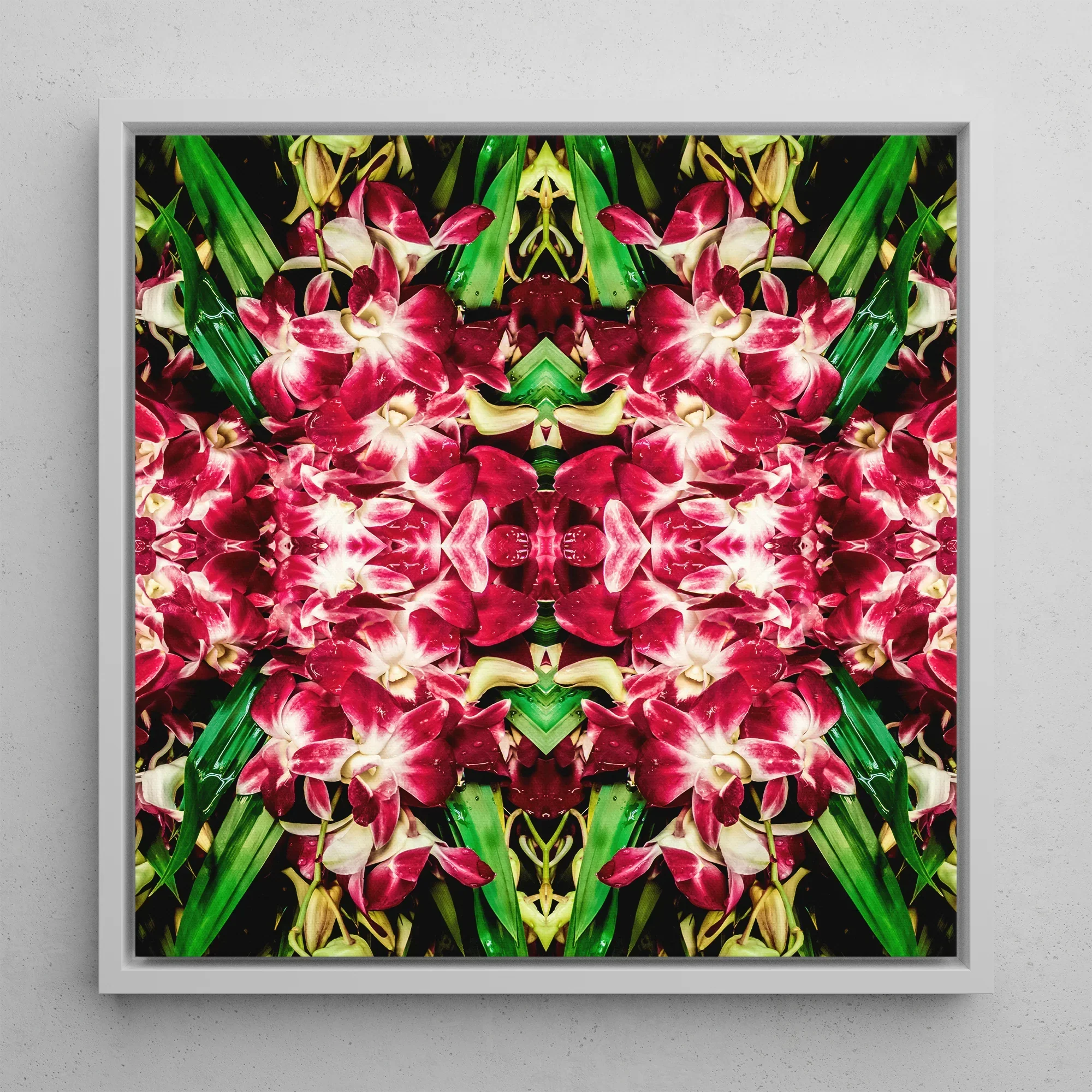 Je zult in de ban worden gebracht door deze vlotter ingelijst canvas, een botanische caleidoscoop van de bruisende bloemenbazaar van Bangkok. Magenta dendrobiums barsten uit in perfecte symmetrie, hun stervormige bloemen vormen een ingewikkelde mandala. Jade-getinte bladeren pannen de compositie als groene bliksem, waardoor een betoverend samenspel van cerise en limoen ontstaat.