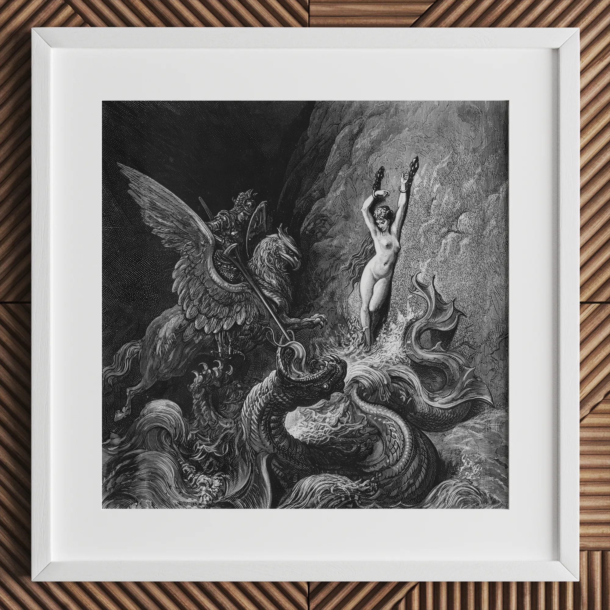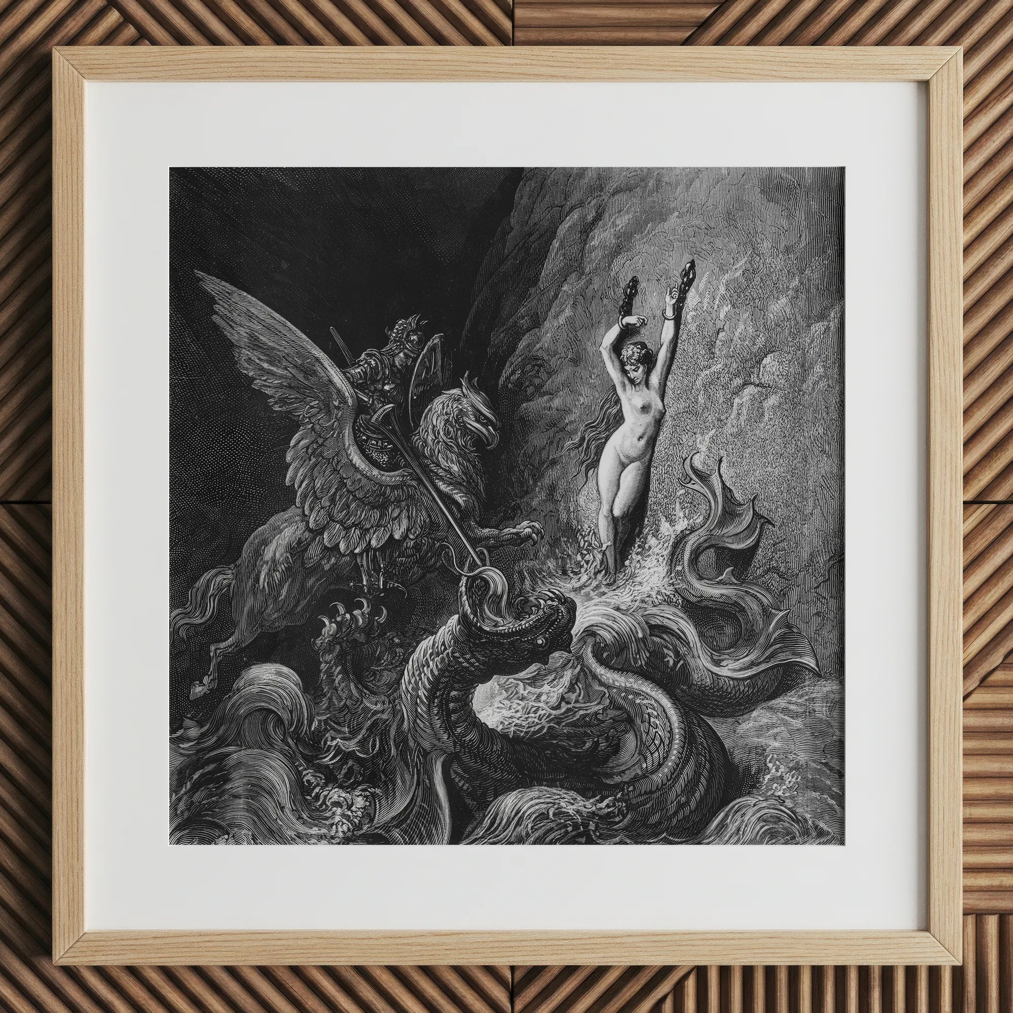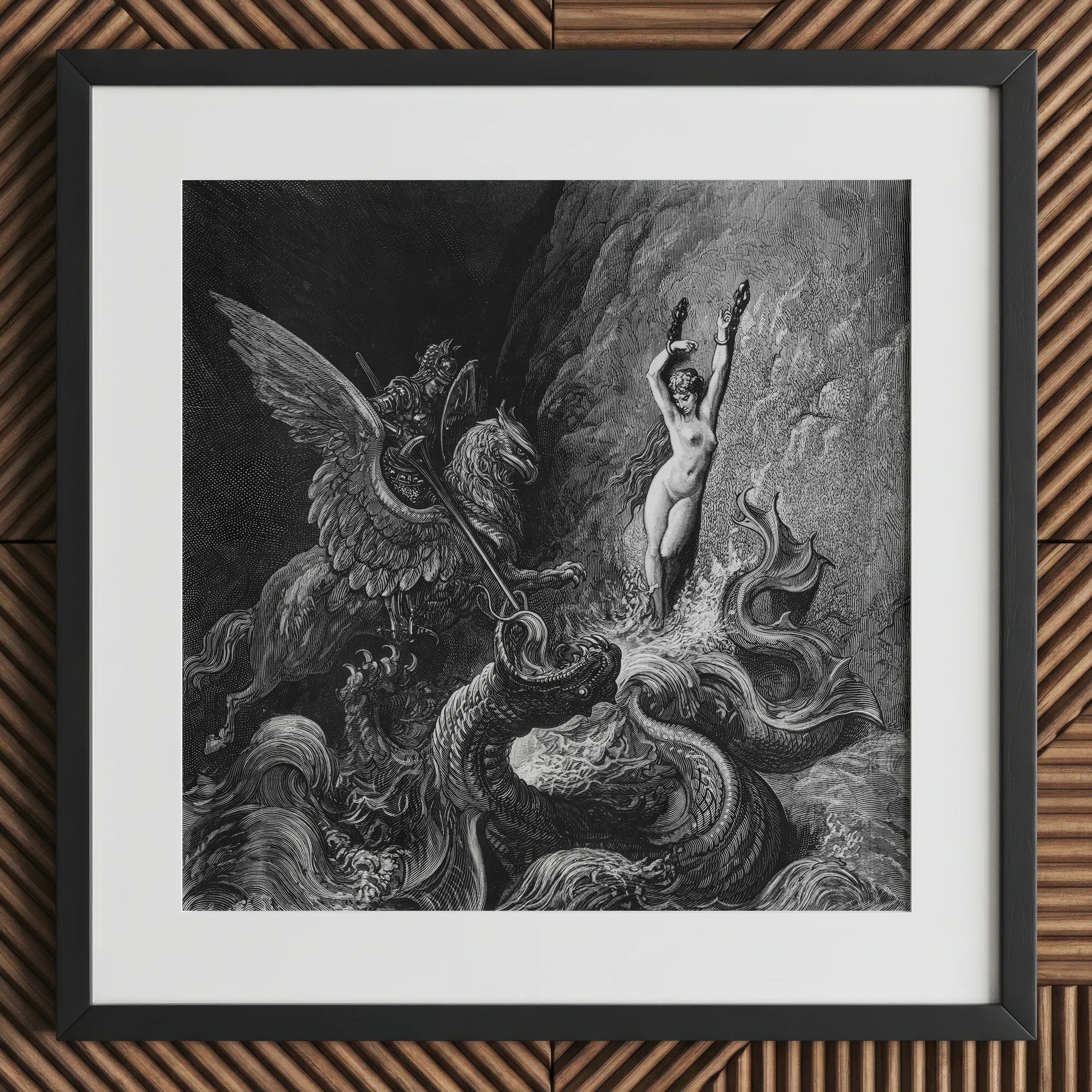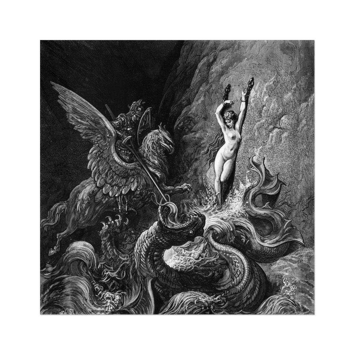 The ocean heaves like molten glass, fractured by the clash of mercy and appetite. Angelica’s chains shimmer; her silence vibrates louder than thunder. Doré choreographs the instant before deliverance—wings beating against oblivion, armor echoing with celestial percussion.