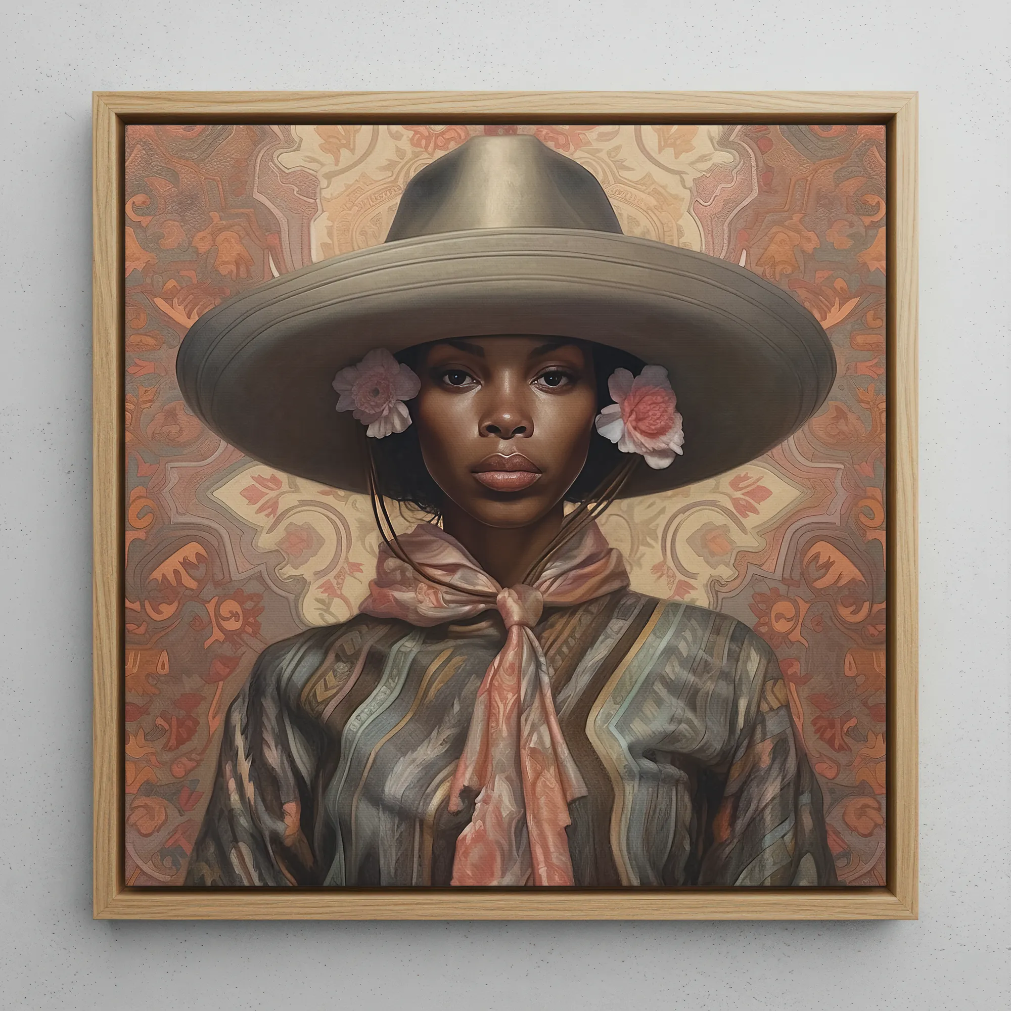 Achter haar ontvouwt een sierlijk paisley-achtergrond zich als een vergeten ballade, een echo van Mexicaanse vaquero-textielen en Harlem Renaissance-kunst die verstrengeld zijn. Het verleden en heden ontmoeten elkaar in haar houding: onverzettelijk, gedurfd, gekust door het vuur van elke outlaw die ooit liefhad buiten de grenzen van toestemming. Sadie is geen mythe. Ze is hier, levend, ademend, uitdagend aan de geschiedenis om haar opnieuw uit te schrijven. Maar de geschiedenis heeft geen zeggenschap. Niet meer.