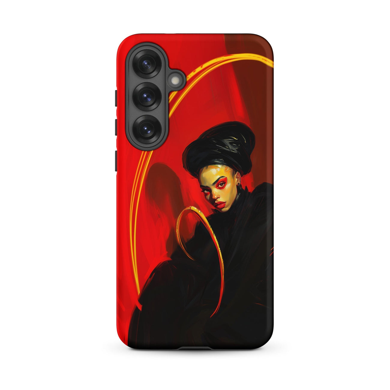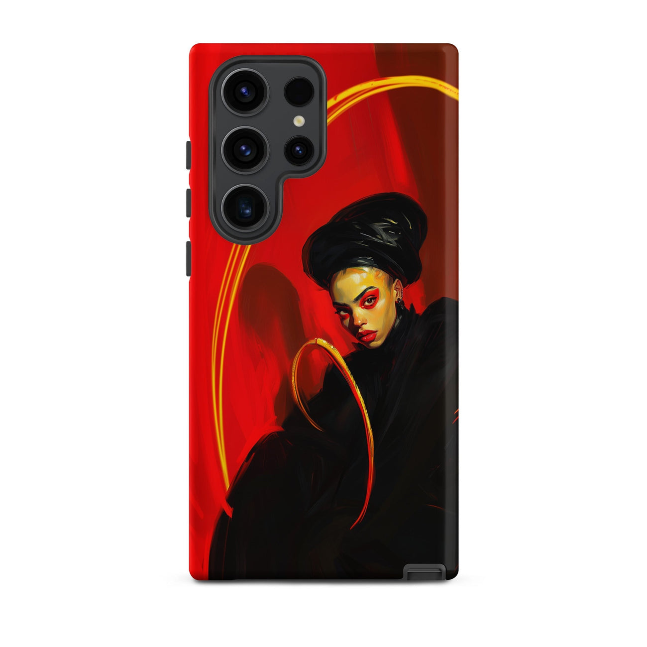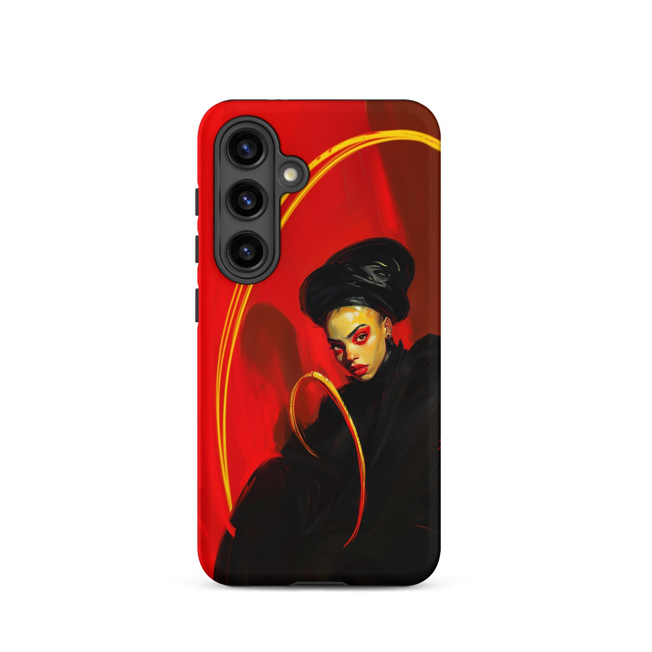 Serafina leunt naar voren, haar blik gesmolten met een precisie die de lucht zou kunnen verschroeien. Geschilderd in gesmolten karmozijnrood en schaduwen dik als middernacht, kronkelt ze binnen de boog van een gouden lus. Deels halo, deels valstrik.