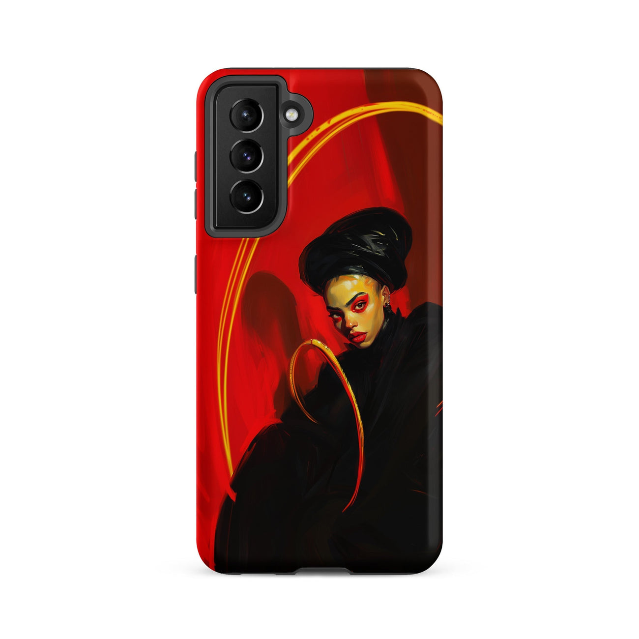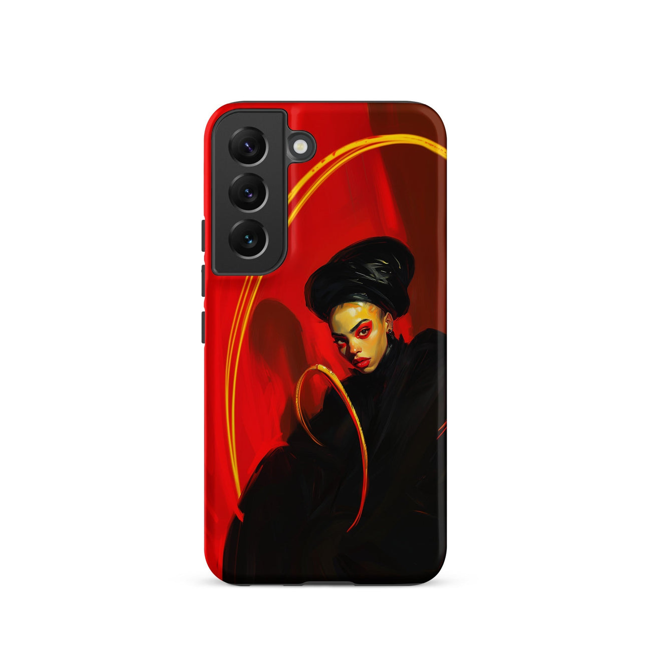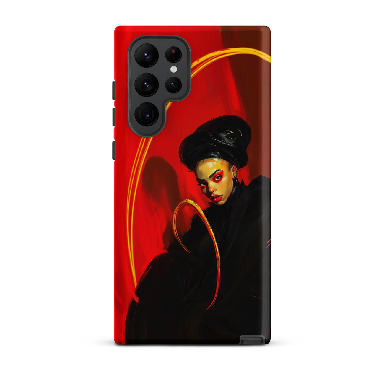 Serafina leunt naar voren, haar blik gesmolten met een precisie die de lucht zou kunnen verschroeien. Geschilderd in gesmolten karmozijnrood en schaduwen dik als middernacht, kronkelt ze binnen de boog van een gouden lus. Deels halo, deels valstrik.